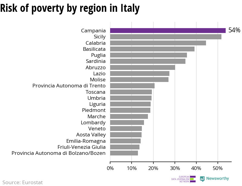 54 percent of people in Campania are living at risk of poverty, according to the figures from 2018. This is the highest rate in Europe1.