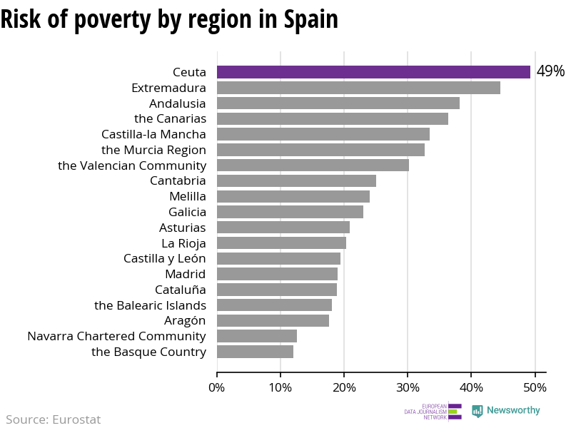In Spain, Ceuta (which has the highest poverty rate) has a risk of poverty four times higher than in the wealthier the Basque Country.