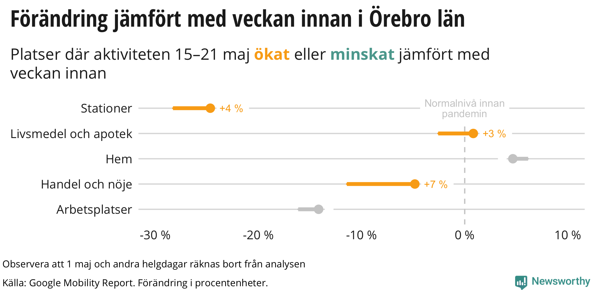 Orkar folk i Örebro hålla i den sociala isoleringen? Med hjälp av data från Google kan vi mäta hur besök till olika typer av platser har förändrats på senaste tiden, jämfört med innan pandemin.