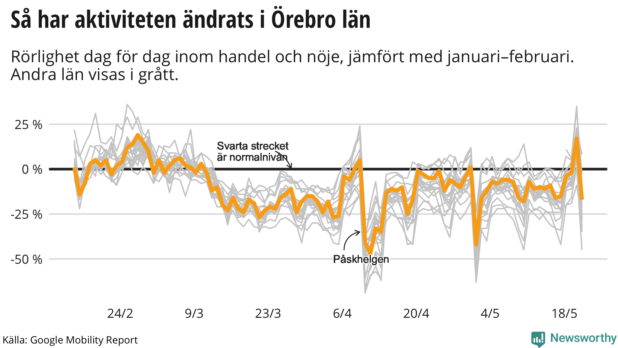 • Statistiken sträcker sig till och med 21 maj. Vi har räknat ut ett medeltal för de föregående sju dagarna och jämfört dels med föregående vecka, dels med Googles egen referensperiod i januari och februari.