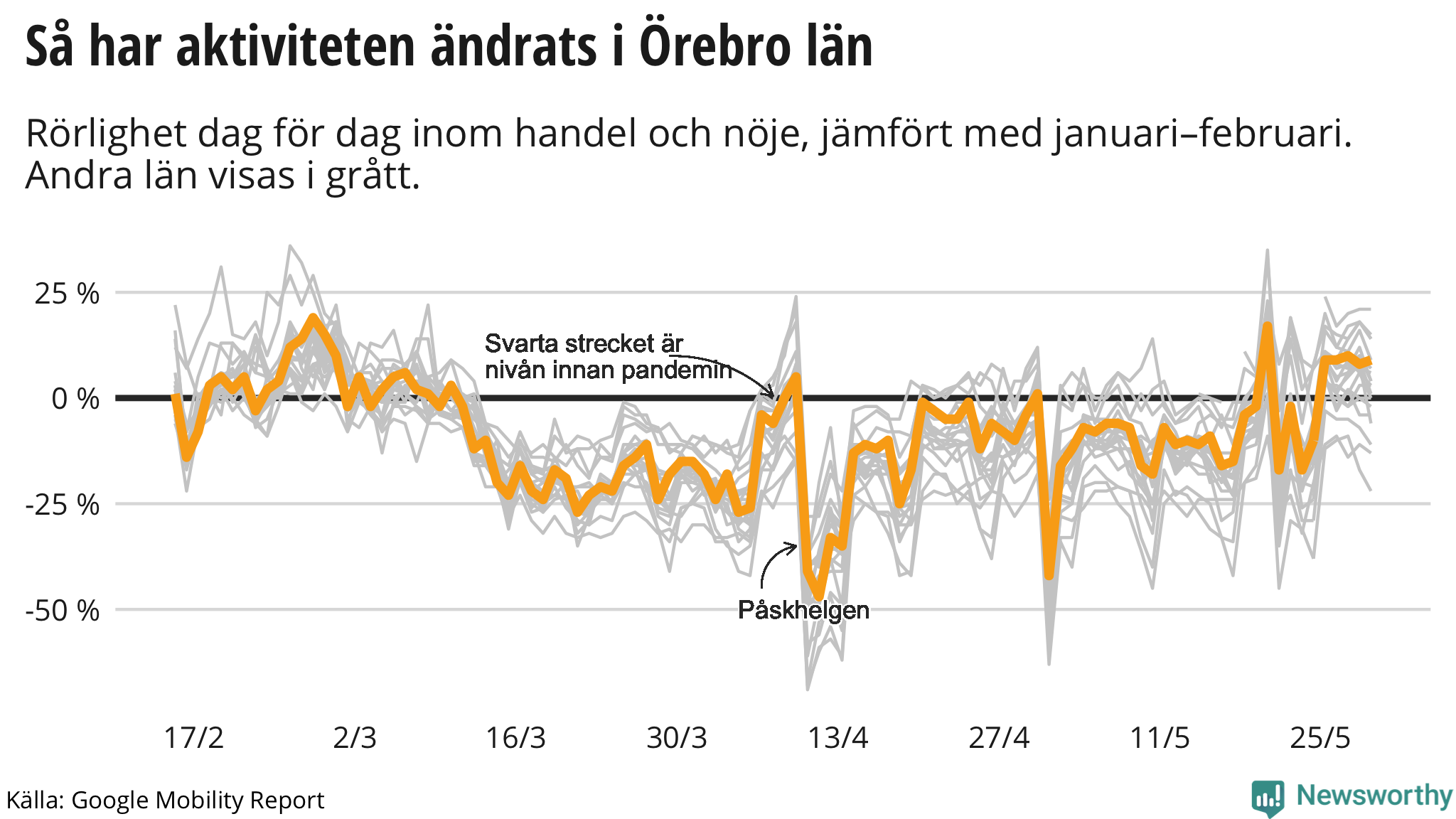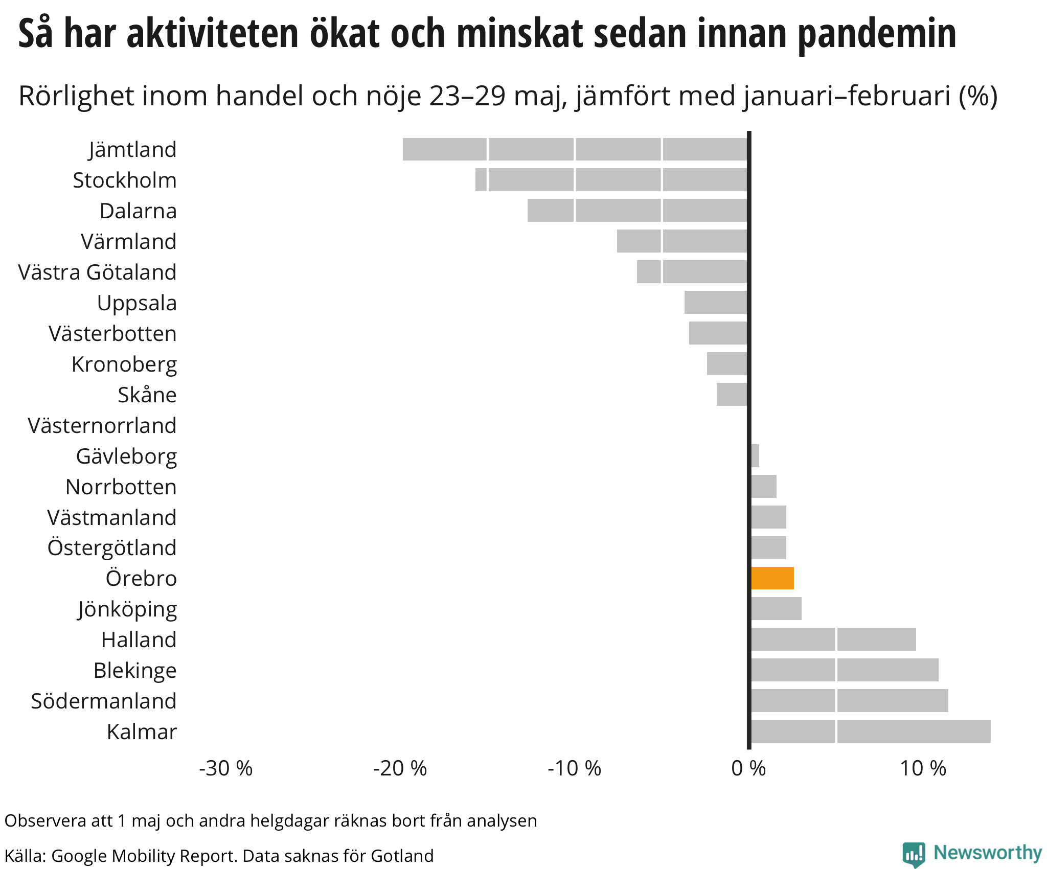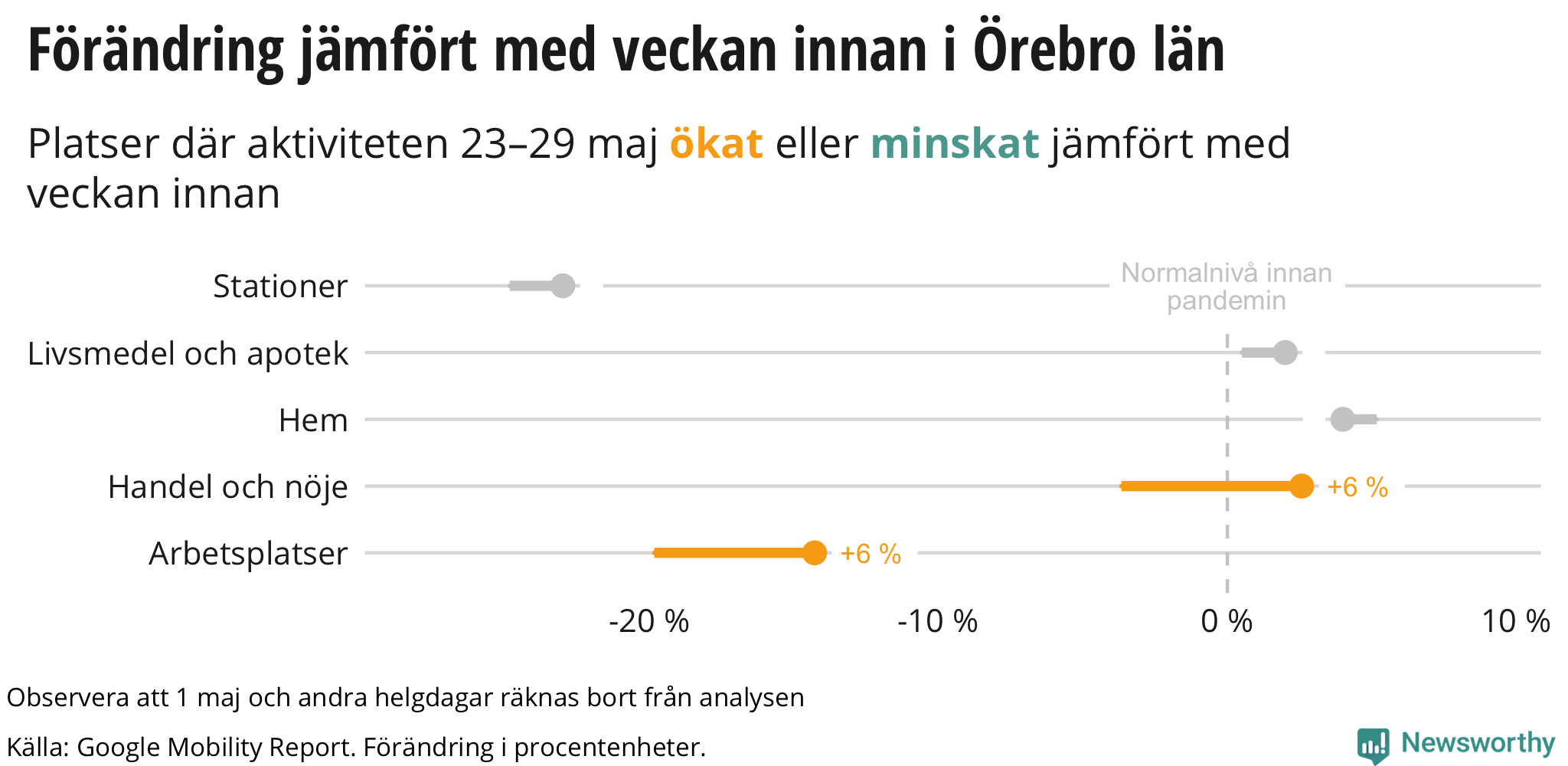 Googles senaste siffror, som publicerades nyligen och som sträcker sig till och med fredagen den 29 maj, visar att invånarna i Örebro rörde sig mer på kaféer, restauranger och i affärer mellan den 23 maj och den 29 maj än veckan innan och man ligger nu på ungefär samma nivå som innan pandemin bröt ut.