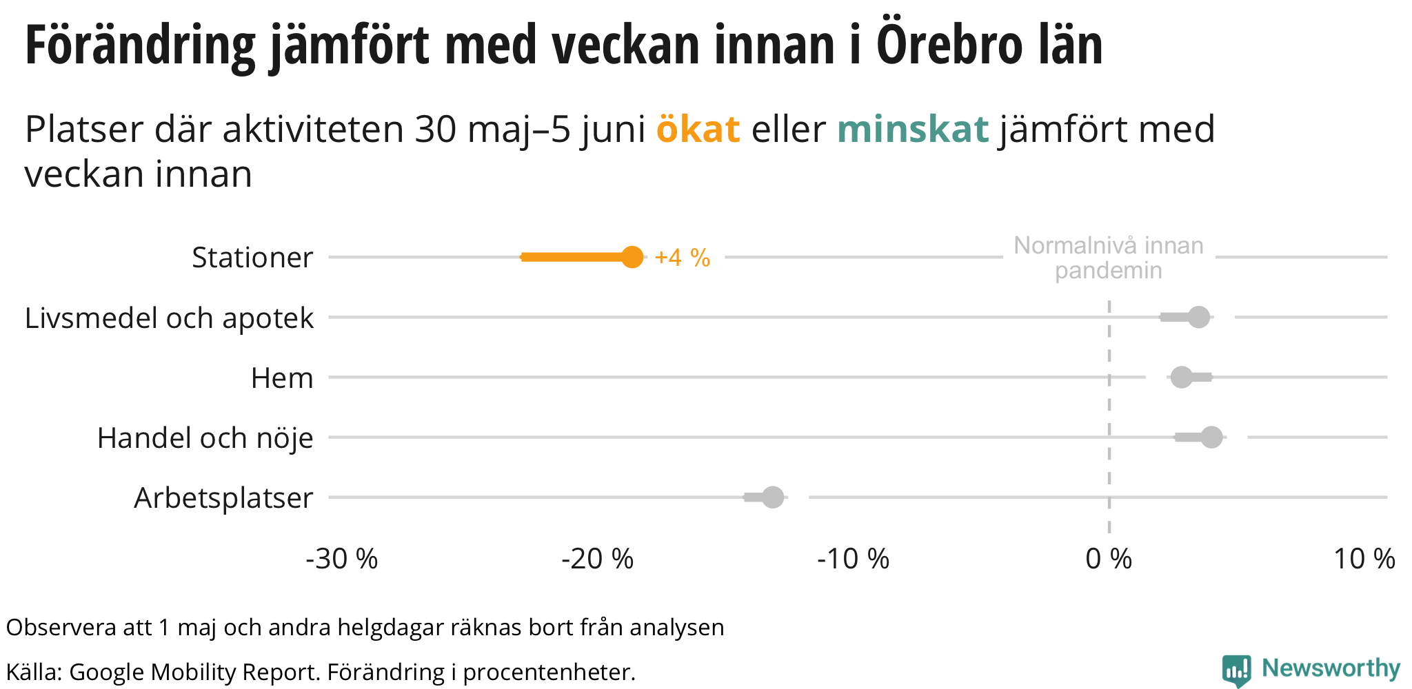 Googles senaste siffror, som publicerades nyligen och som sträcker sig till och med fredagen den 5 juni, visar att invånarna i Örebro rörde sig ungefär lika mycket på kaféer, restauranger och i affärer mellan den 30 maj och den 5 juni som veckan innan.