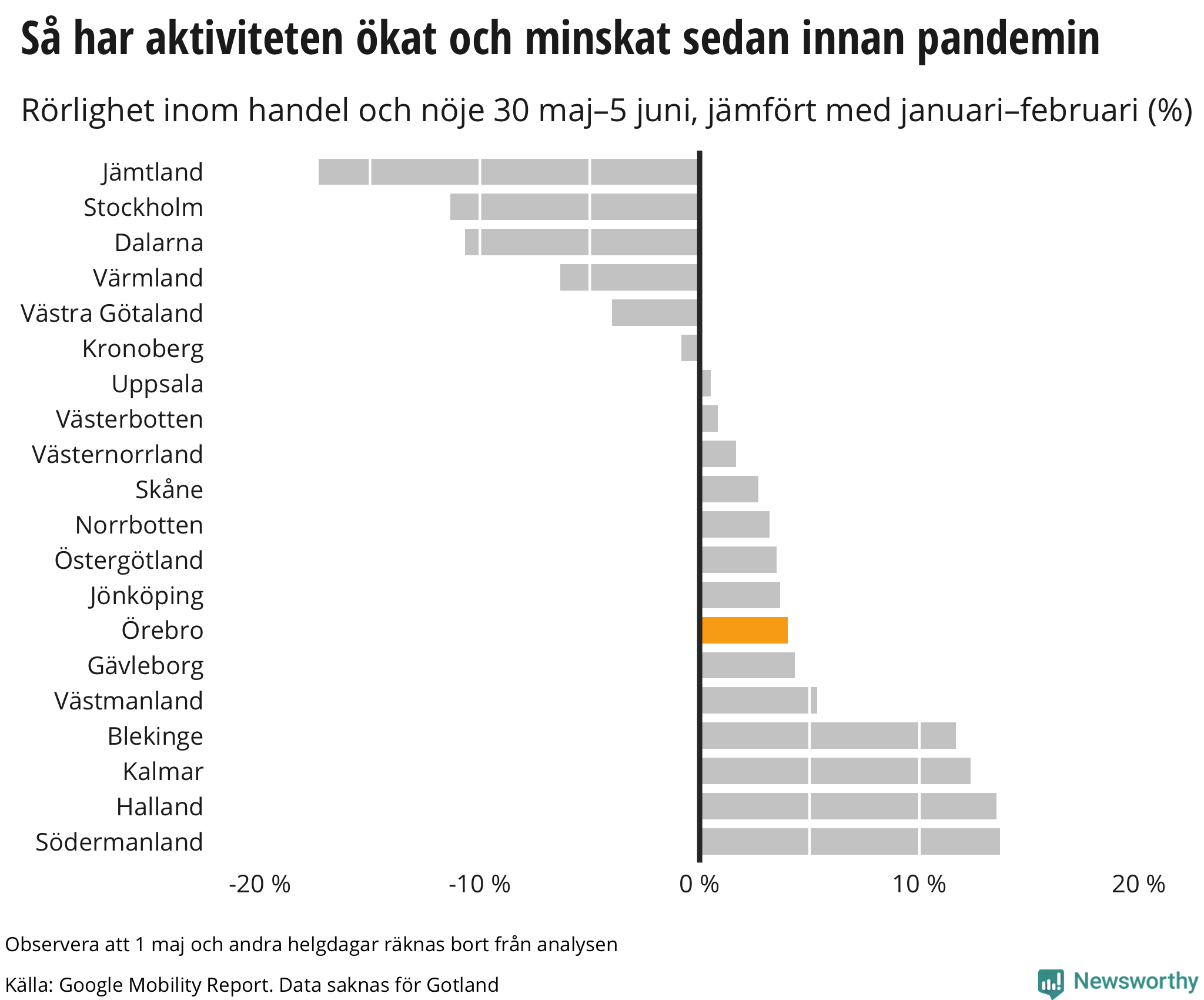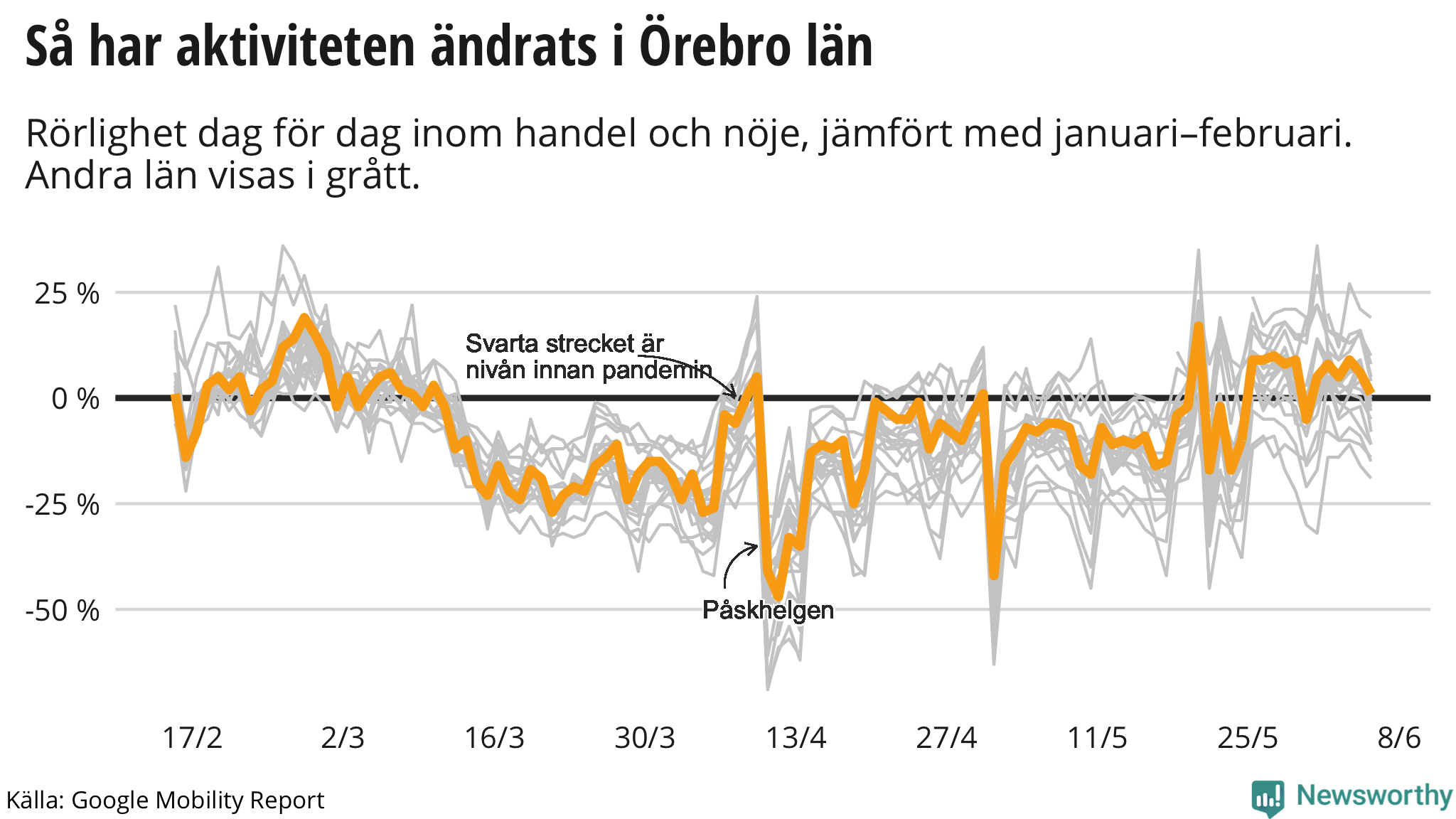 Orkar folk i Örebro hålla i den sociala isoleringen? Med hjälp av data från Google kan vi mäta hur besök till olika typer av platser har förändrats på senaste tiden, jämfört med innan pandemin.