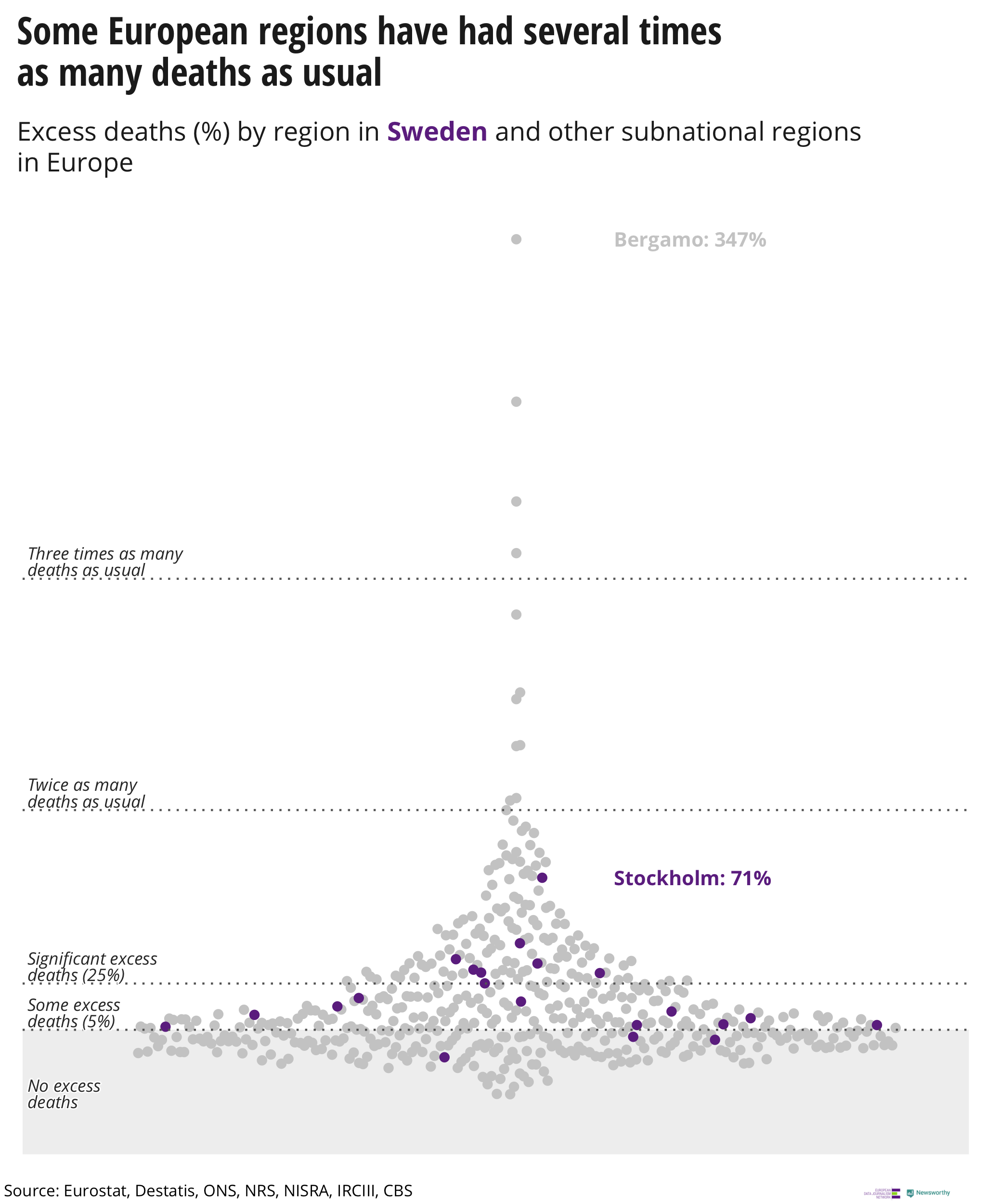 To better understand the spread of the virus we have gathered data on excess deaths from 500 subnational regions, across 20 European countries. The data has been collected from national statistical agencies as well as aggregated through Eurostat.