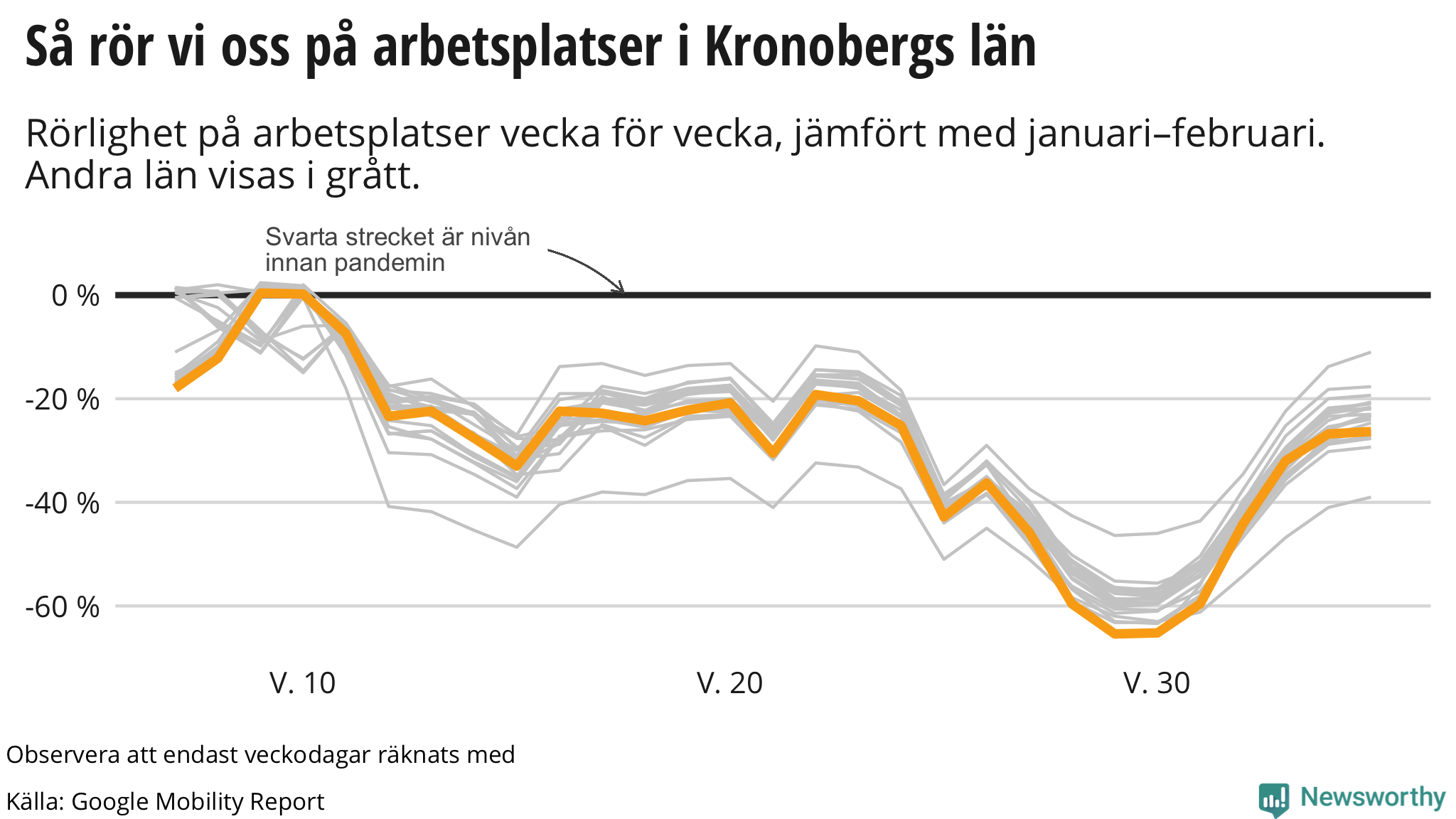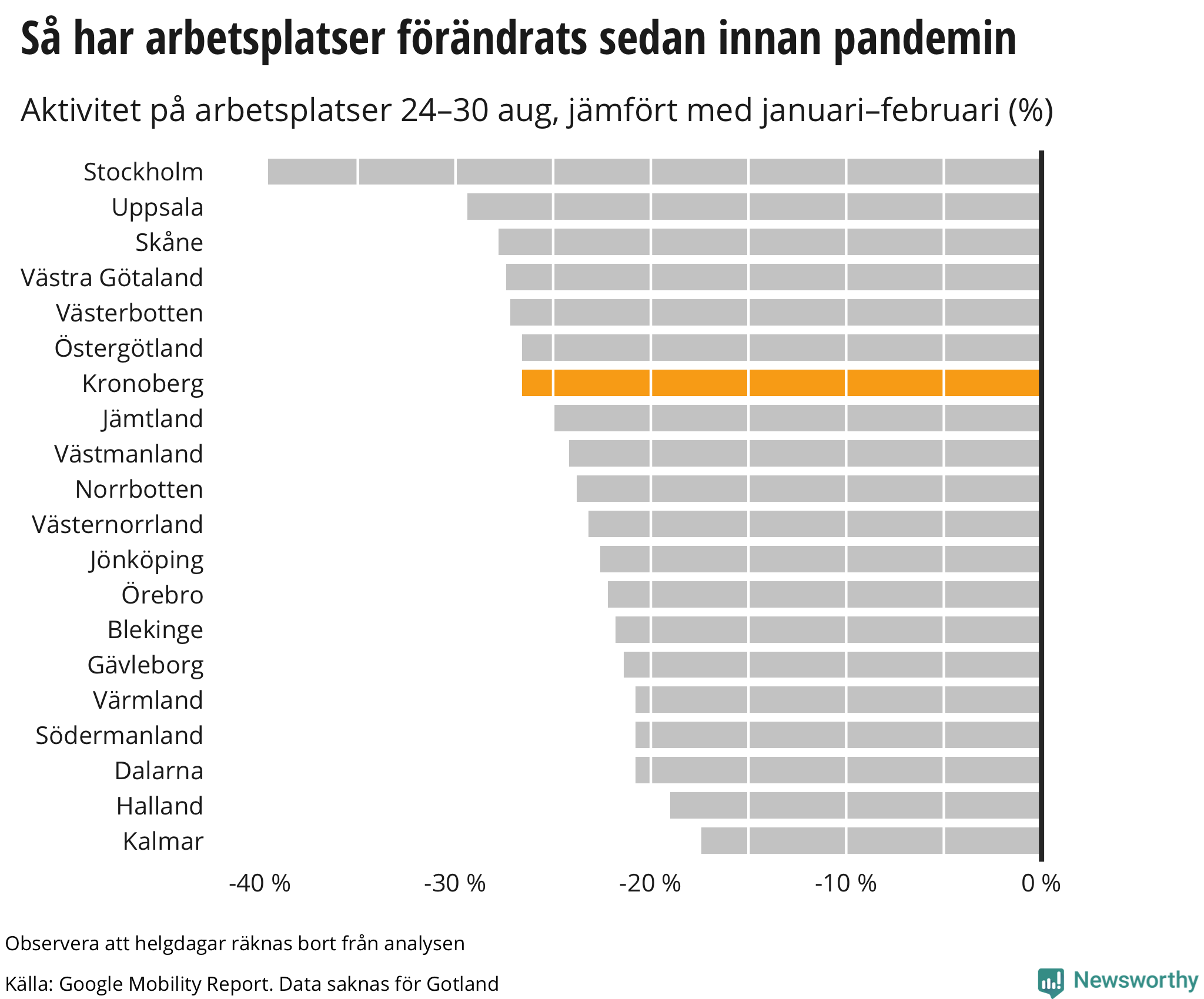 Googles senaste siffror, som publicerades nyligen, visar att invånarna i Kronoberg rörde sig ungefär lika mycket på arbetsplatser mellan den 24 augusti och den 30 augusti som veckan innan, men fortfarande betydligt mindre än innan pandemin.