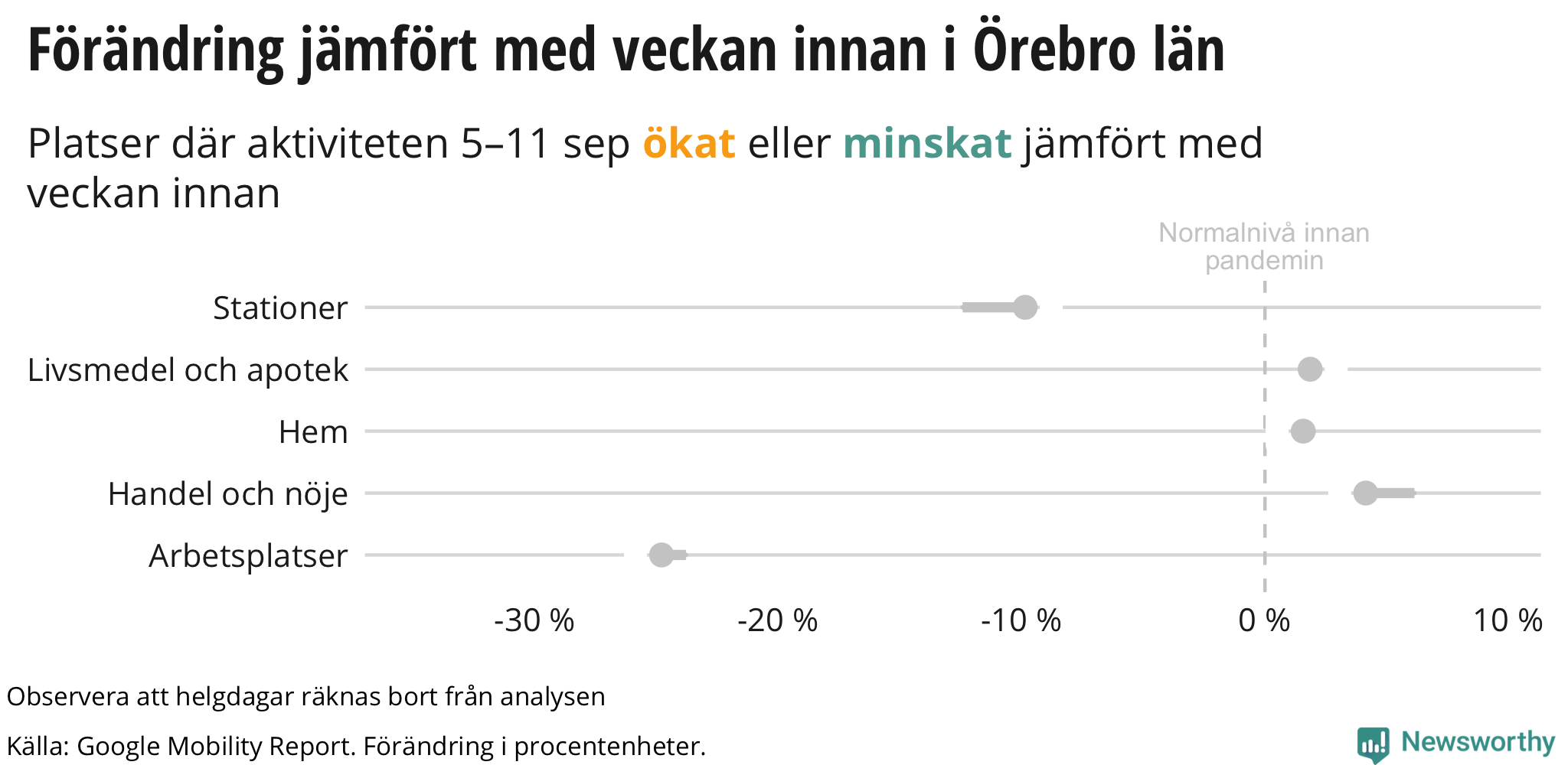 Google-rapporten använder en fem veckors-period i januari och februari som referens. Jämfört med den referensperioden var det mellan den 5 september och den 11 september 25 procent lägre aktivitet på arbetsplatser i Örebro.