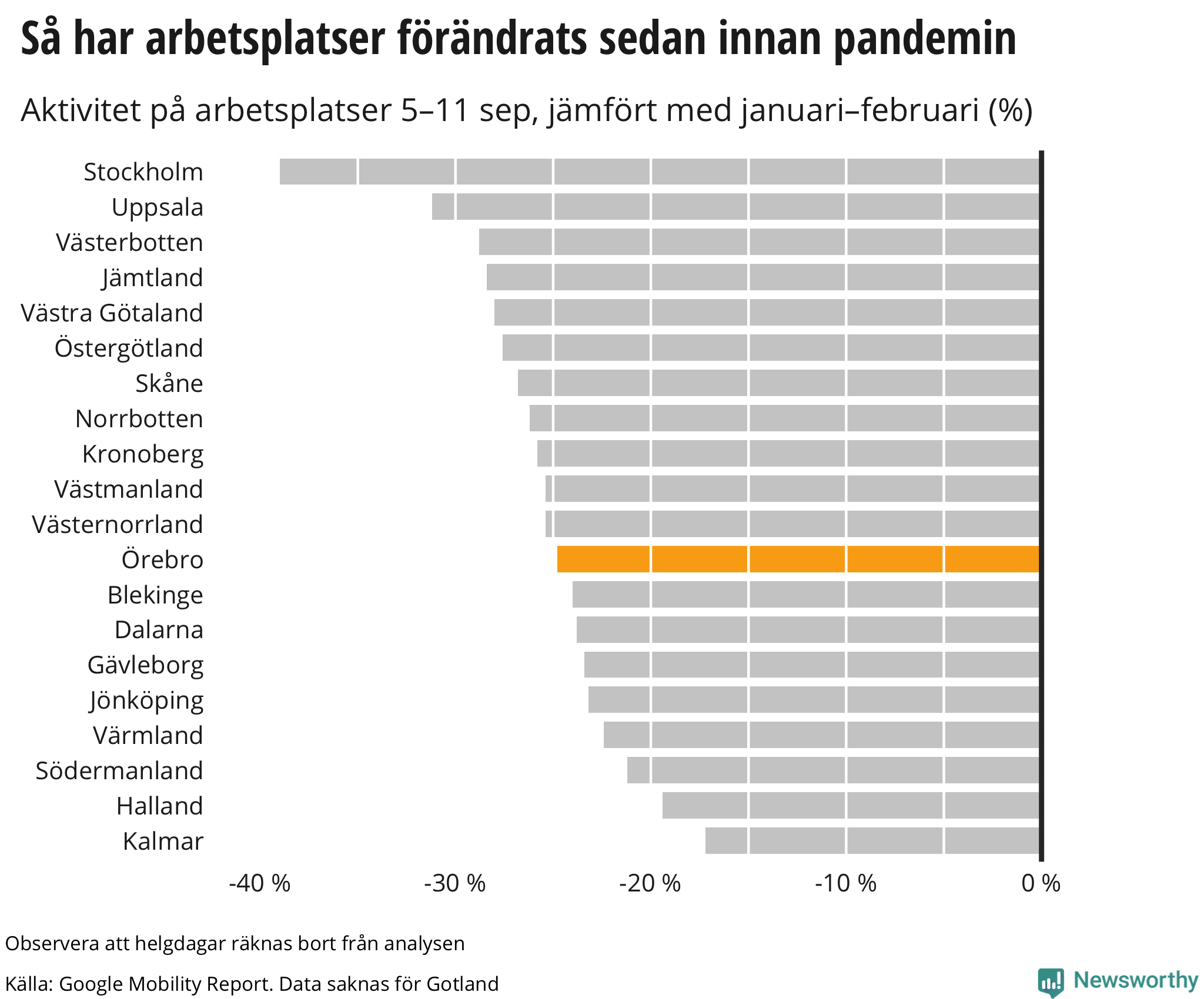 Googles senaste siffror, som publicerades nyligen, visar att invånarna i Örebro rörde sig ungefär lika mycket på arbetsplatser mellan den 5 september och den 11 september som veckan innan, men fortfarande betydligt mindre än innan pandemin.