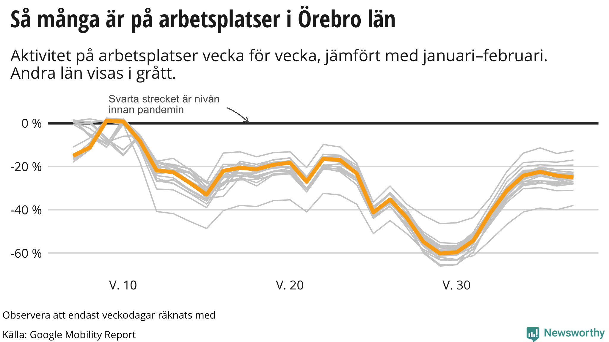 Fortsätter distansarbetet i Örebro eller är fler tillbaka på kontoret? Med hjälp av data från Google kan vi mäta hur besök till olika typer av platser har förändrats på senaste tiden, jämfört med innan pandemin.