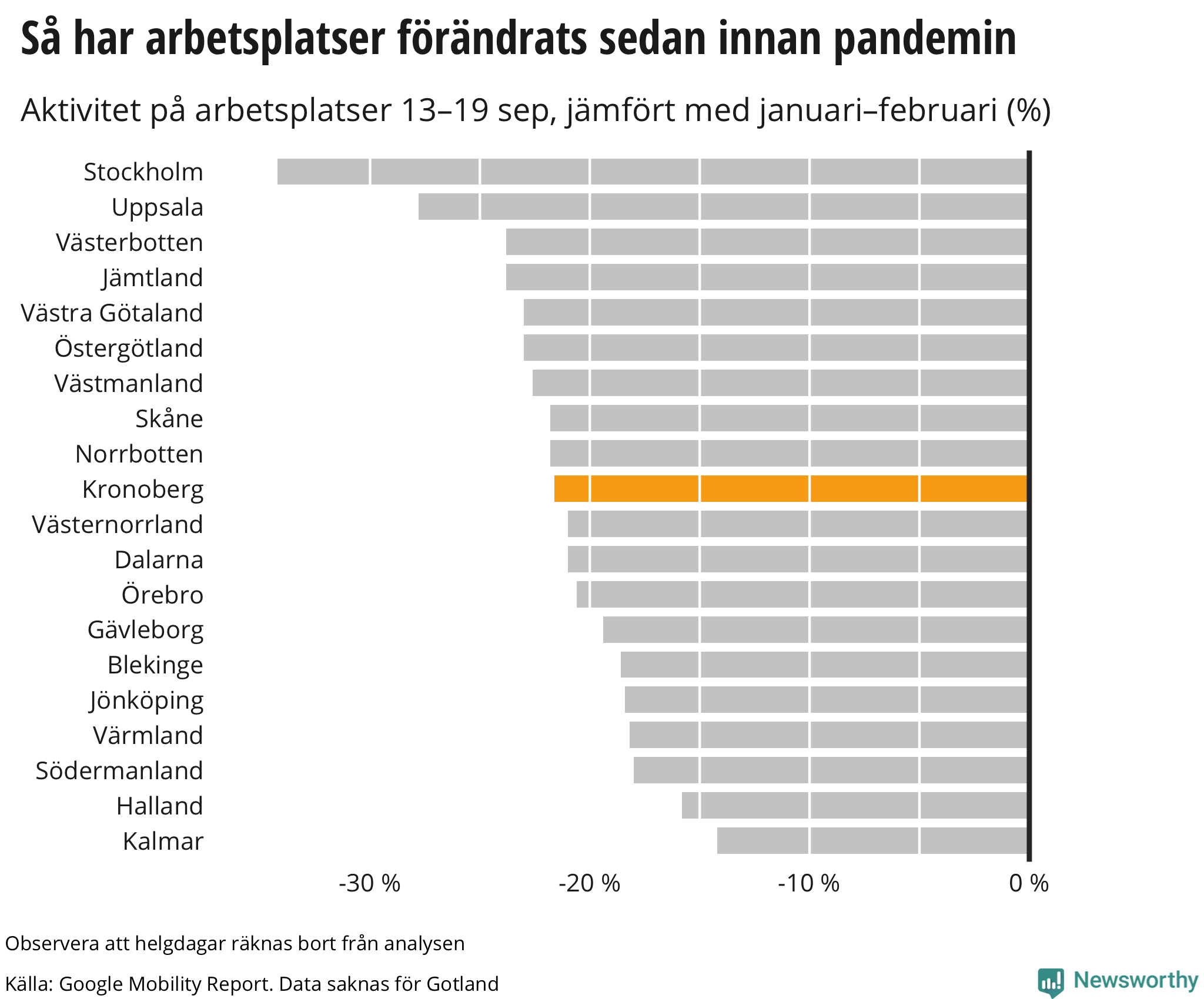 Googles senaste siffror, som publicerades nyligen, visar att invånarna i Kronoberg rörde sig mer på arbetsplatser mellan den 13 september och den 19 september än veckan innan, men fortfarande långt mindre än innan pandemin bröt ut.