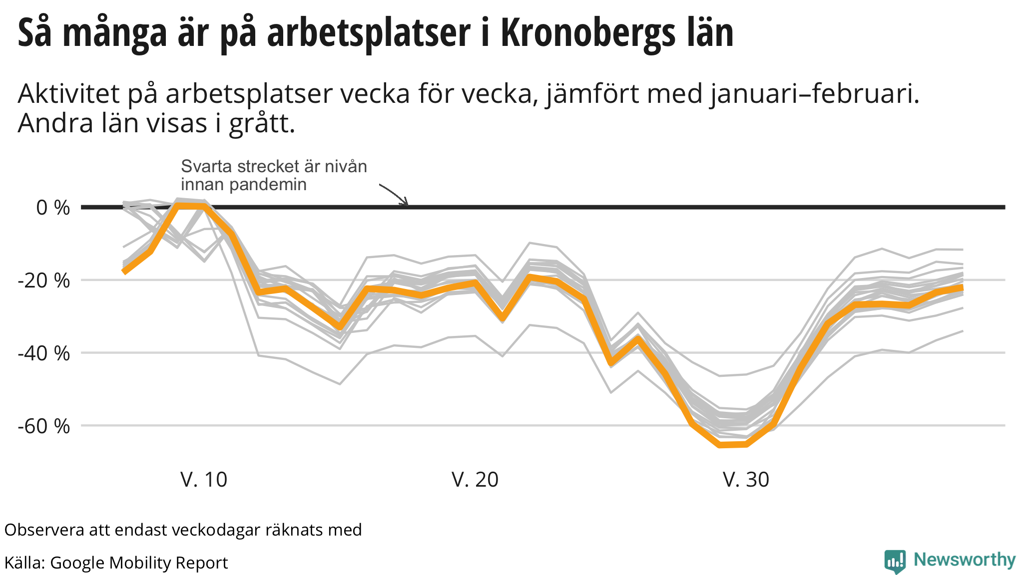 Google-rapporten använder en fem veckors-period i januari och februari som referens. Jämfört med den referensperioden var det mellan den 13 september och den 19 september 22 procent lägre aktivitet på arbetsplatser i Kronoberg.