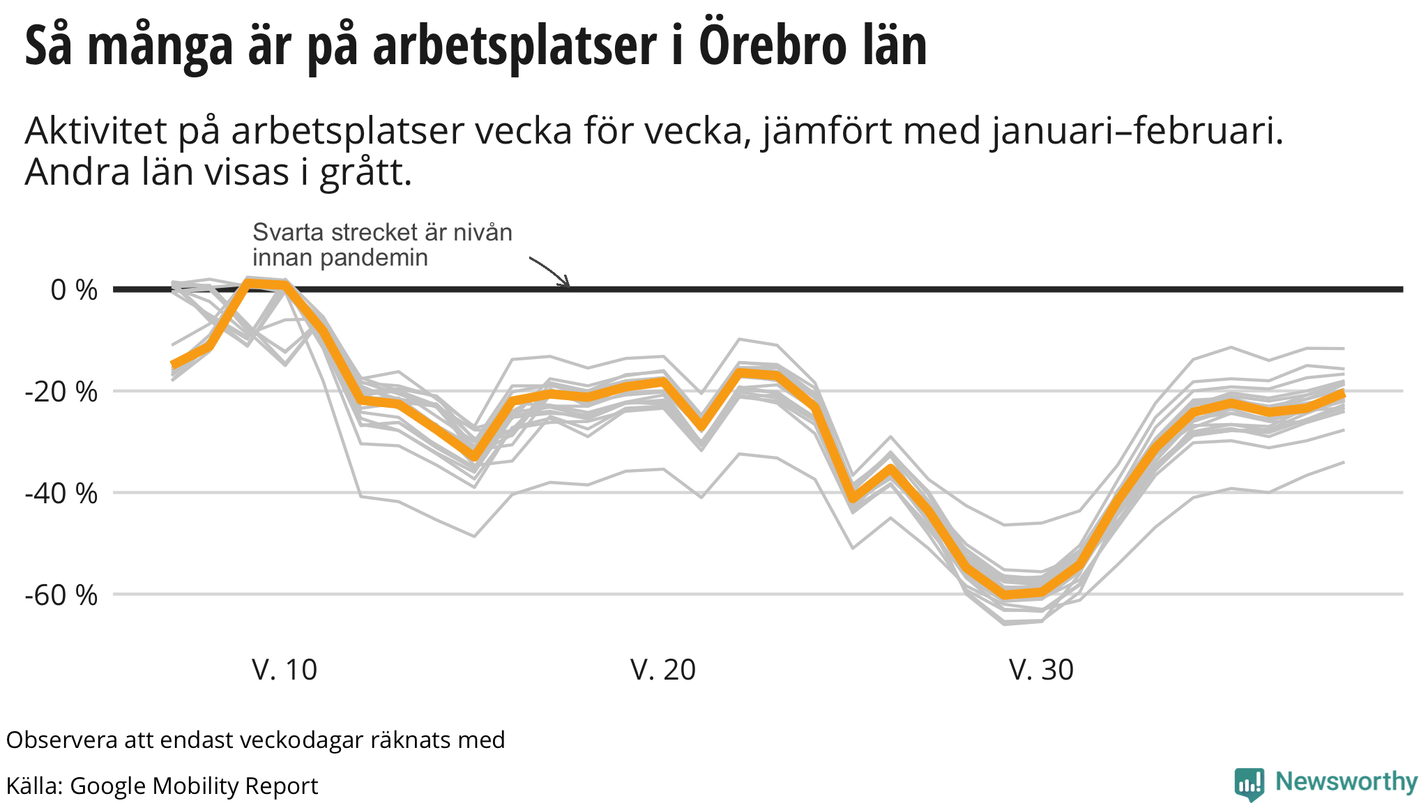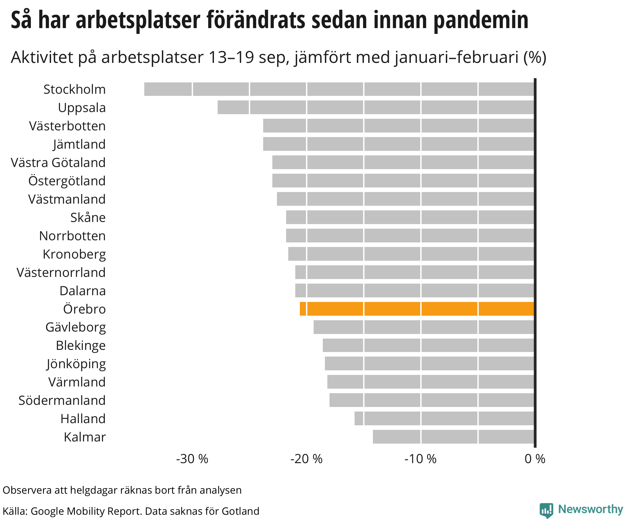 Googles senaste siffror, som publicerades nyligen, visar att invånarna i Örebro rörde sig mer på arbetsplatser mellan den 13 september och den 19 september än veckan innan, men fortfarande långt mindre än innan pandemin bröt ut.
