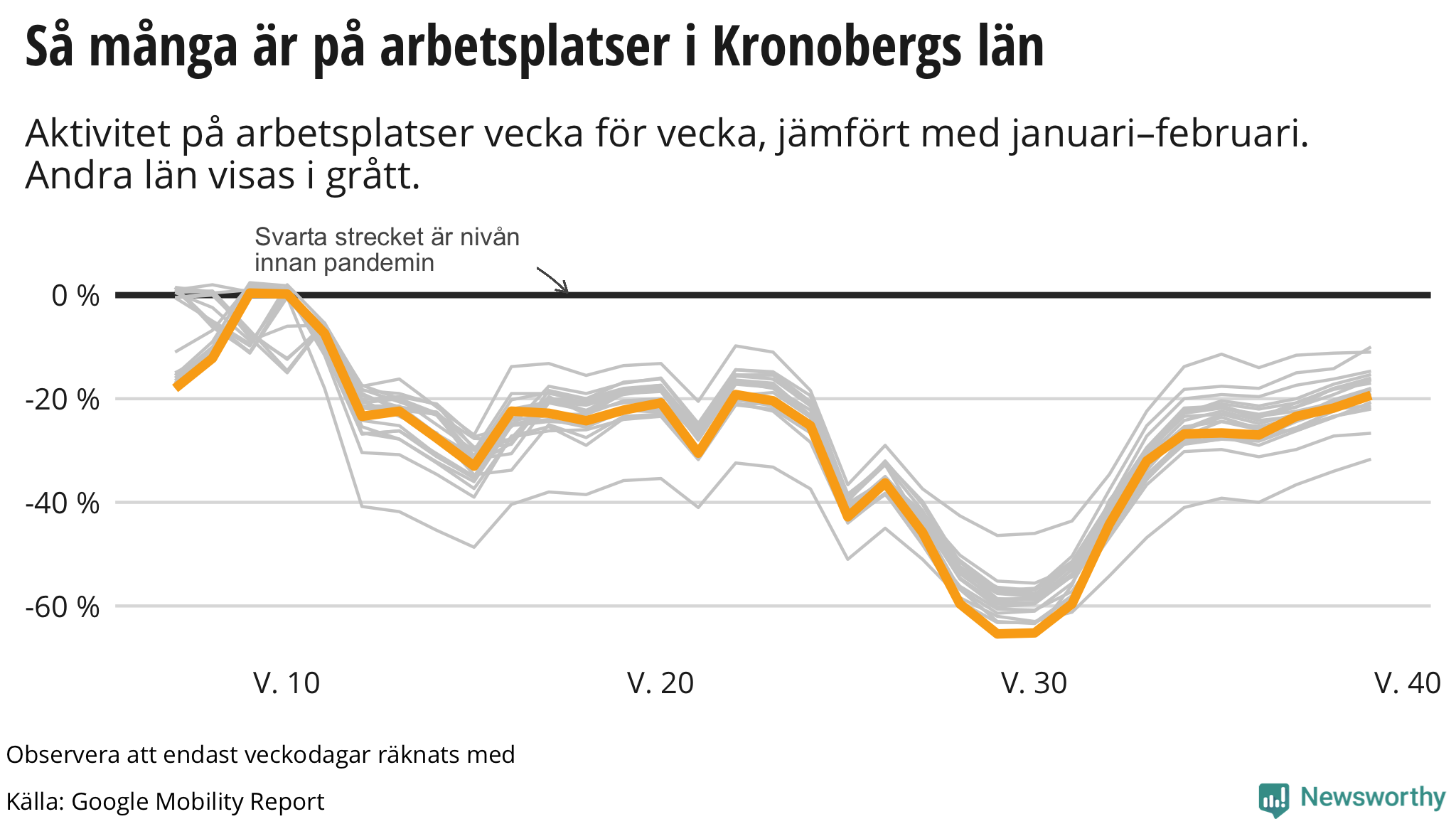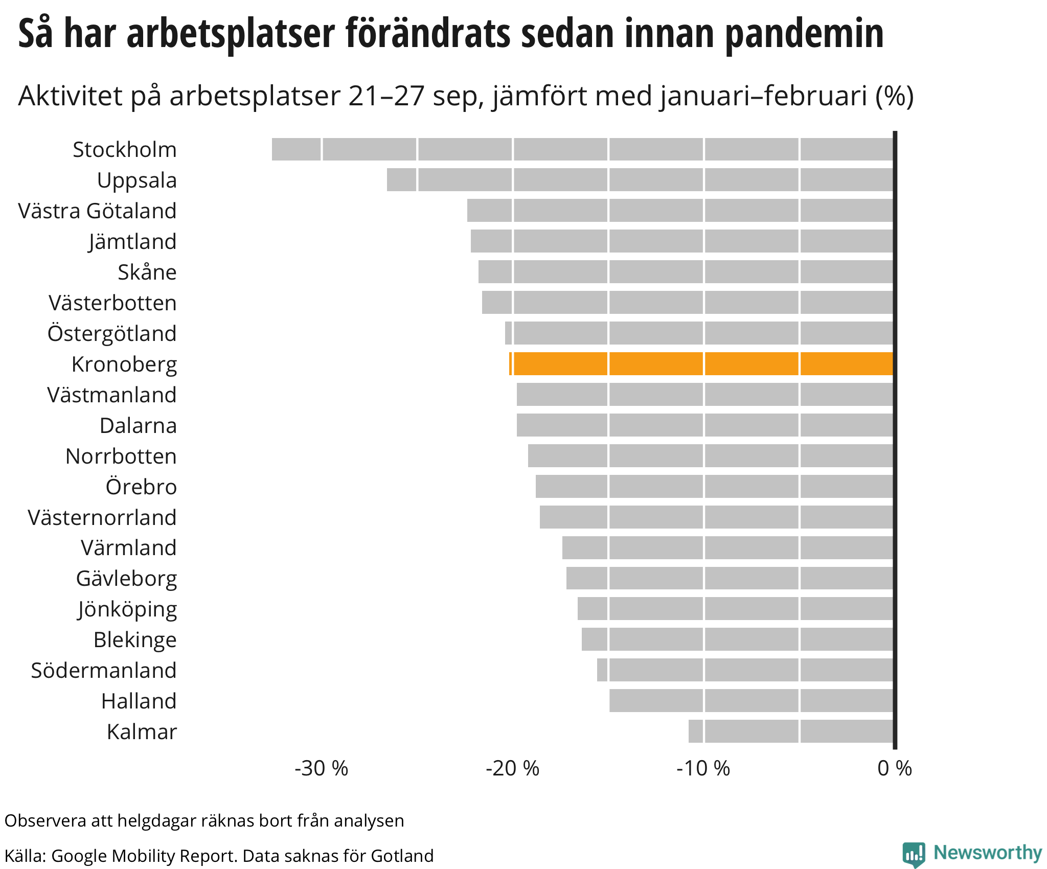Googles senaste siffror, som publicerades nyligen, visar att invånarna i Kronoberg rörde sig ungefär lika mycket på arbetsplatser mellan den 21 september och den 27 september som veckan innan, men fortfarande betydligt mindre än innan pandemin.