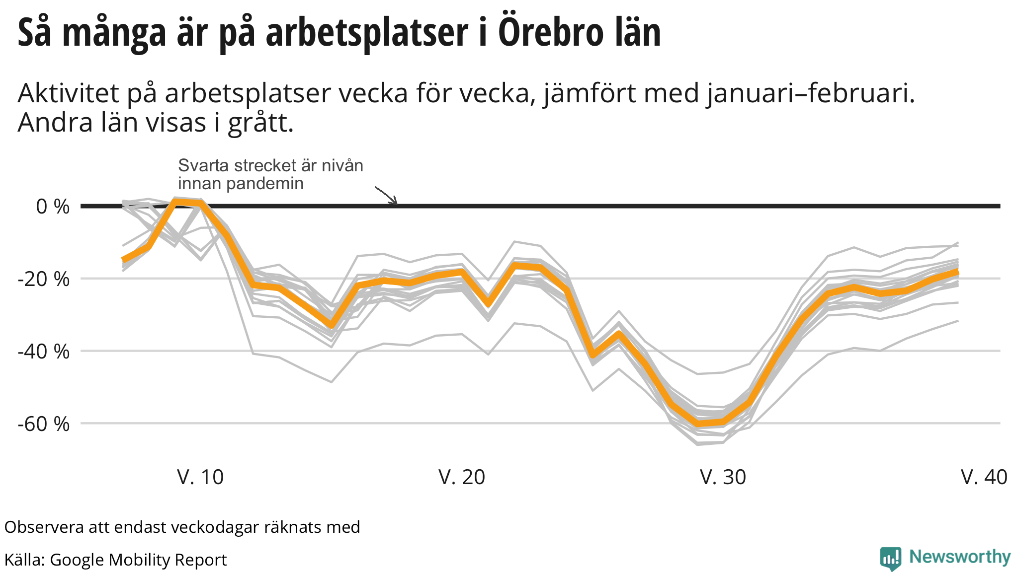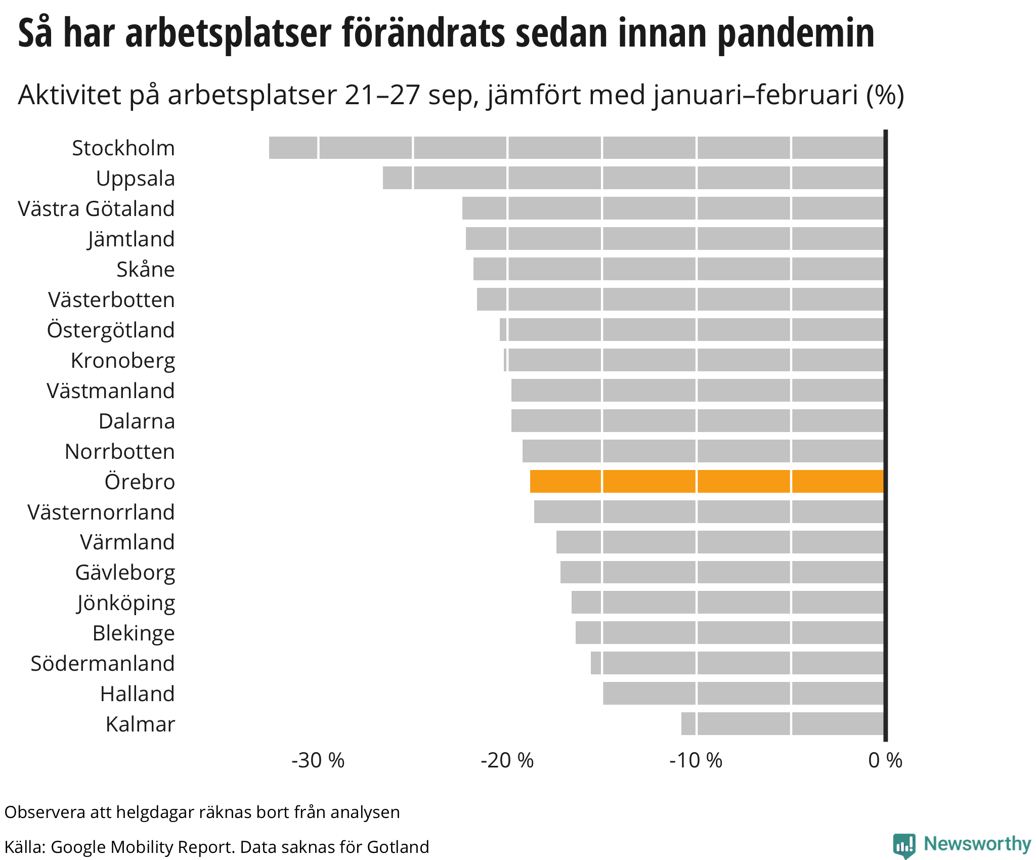 Googles senaste siffror, som publicerades nyligen, visar att invånarna i Örebro rörde sig ungefär lika mycket på arbetsplatser mellan den 21 september och den 27 september som veckan innan, men fortfarande betydligt mindre än innan pandemin.