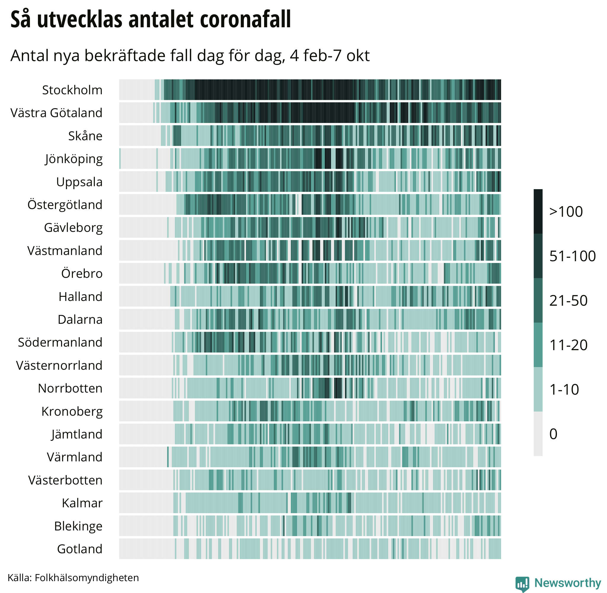 Så här har antalet nya bekräftade fall utvecklats, län för län och dag för dag.
