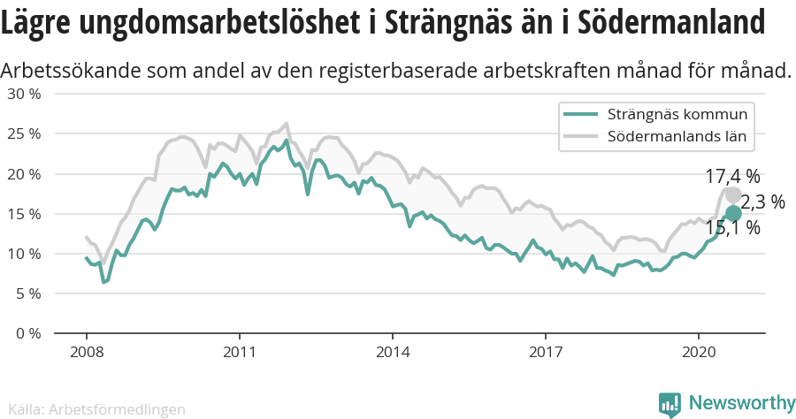 Precis som den totala arbetslösheten ligger ungdomsarbetslösheten i Strängnäs lägre än i Södermanland som helhet. Skillnaden mellan kommunen och länet är 2,3 procentenheter.