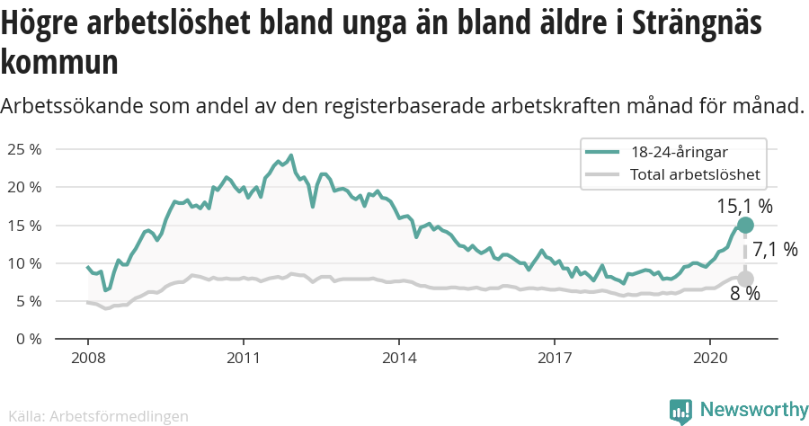 I och med den senaste månadens uppgång har de ungas arbetslöshet i Strängnäs stigit 19 månader i följd (upp från 7,9 procent i februari 2019 till 15,1 procent nu). Den nuvarande arbetslöshetsnivån är den högsta sedan augusti 2014.
