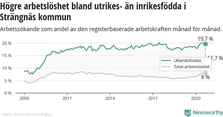 Arbetslösheten bland utlandsfödda var 19,7 procent i Strängnäs under september månad, motsvarande 609 av 3 091 personer. Det är 1,1 procentenheter fler än vid samma tidpunkt i fjol (+77 om man räknar personer). Därmed stiger de utlandsföddas arbetslöshet för sjunde månaden i följd. Sedan februari har arbetslösheten bland utlandsfödda ökat från 17,8 till 19,7 procent.