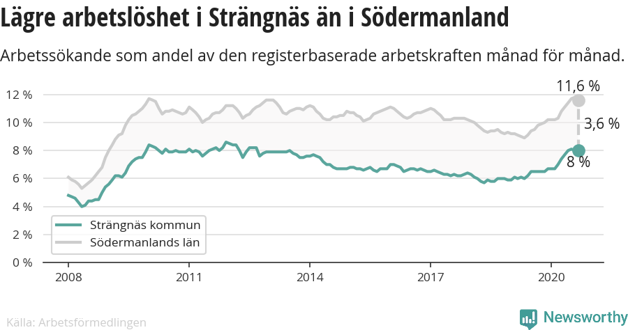 Under september månad rapporterade Strängnäs en total arbetslöshet på 8,0 procent. Det är en ökning jämfört med samma tidpunkt i fjol (+1,5 procentenheter). Även i Södermanlands län stiger arbetslösheten betydligt.