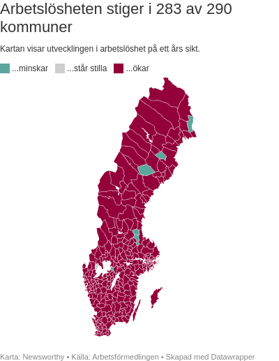 I riket som helhet steg arbetslösheten i september jämfört med året innan (+2,0 procentenheter) och ligger nu på 9,0 procent. 283 av 290 kommuner har högre arbetslöshet i dag än för ett år sedan.