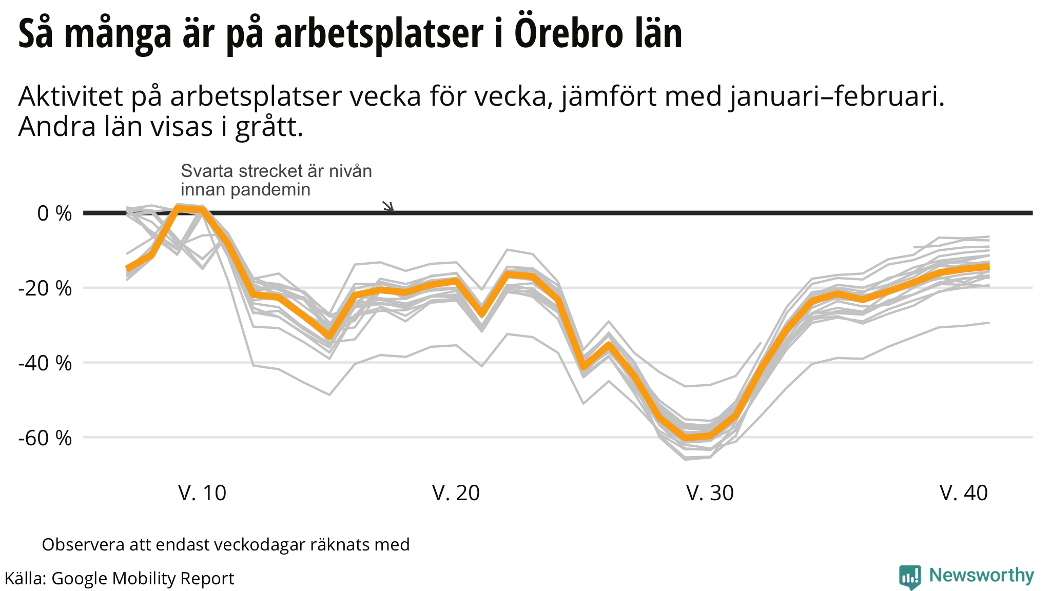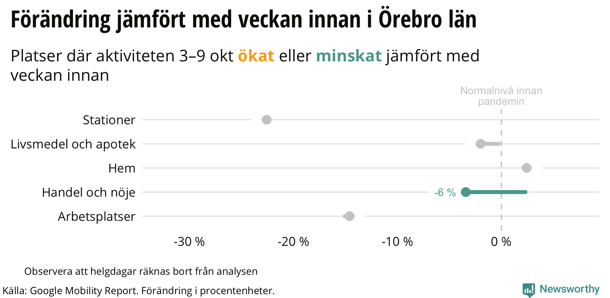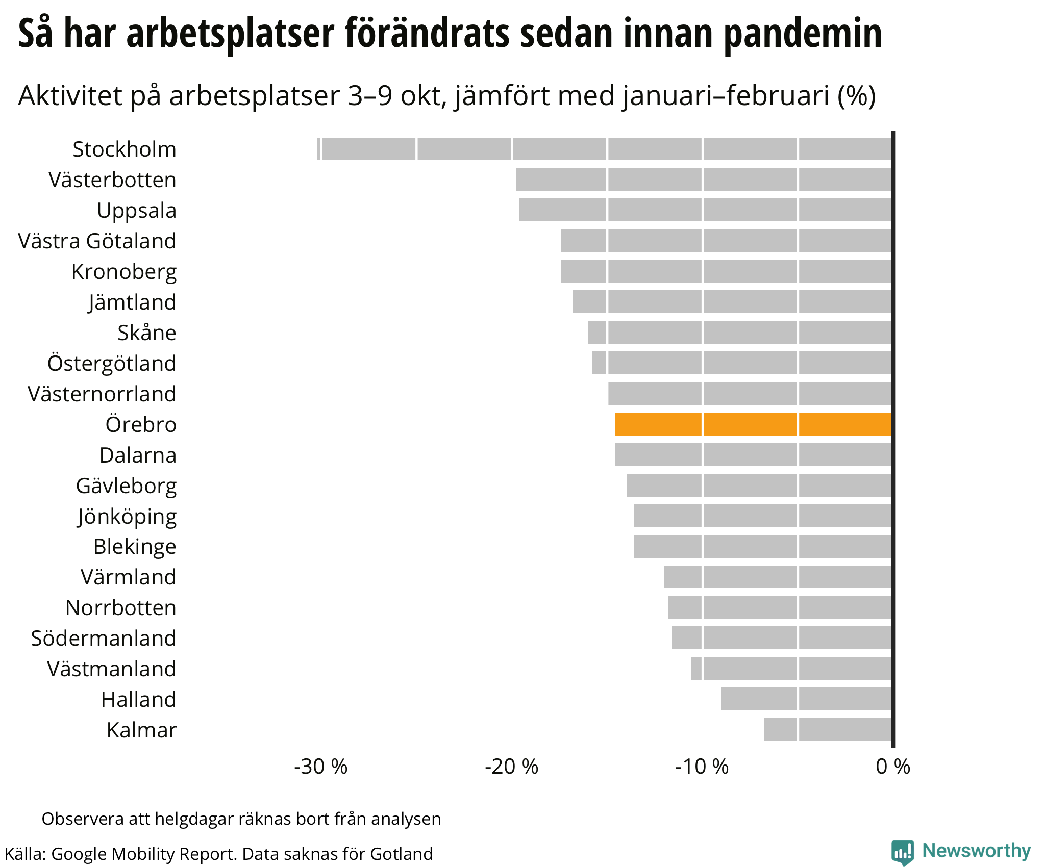 Google-rapporten använder en fem veckors-period i januari och februari som referens. Jämfört med den referensperioden var det mellan den 3 oktober och den 9 oktober 15 procent lägre aktivitet på arbetsplatser i Örebro.