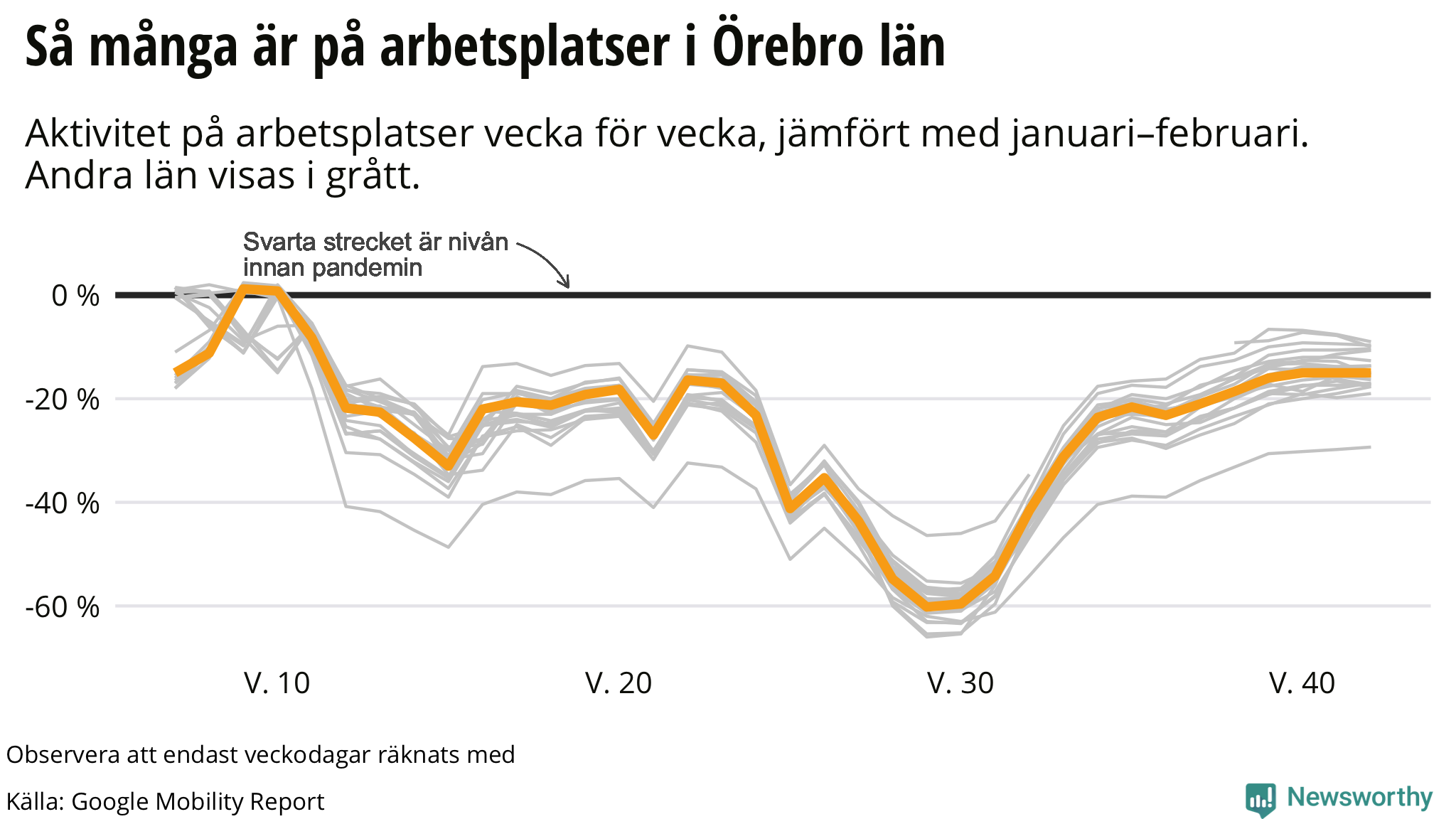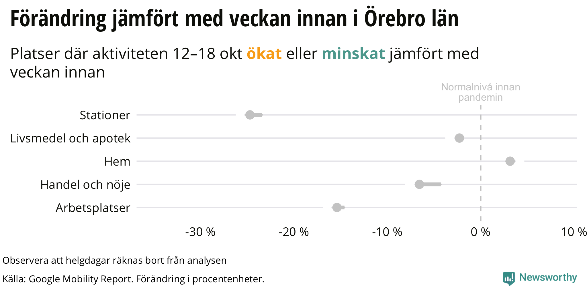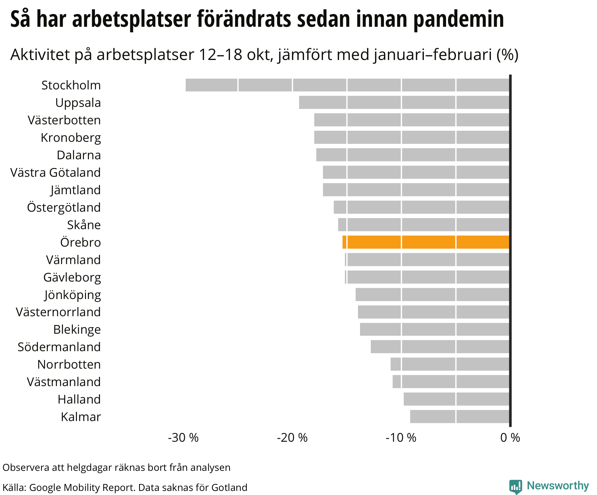Google-rapporten använder en fem veckors-period i januari och februari som referens. Jämfört med den referensperioden var det mellan den 12 oktober och den 18 oktober 15 procent lägre aktivitet på arbetsplatser i Örebro.