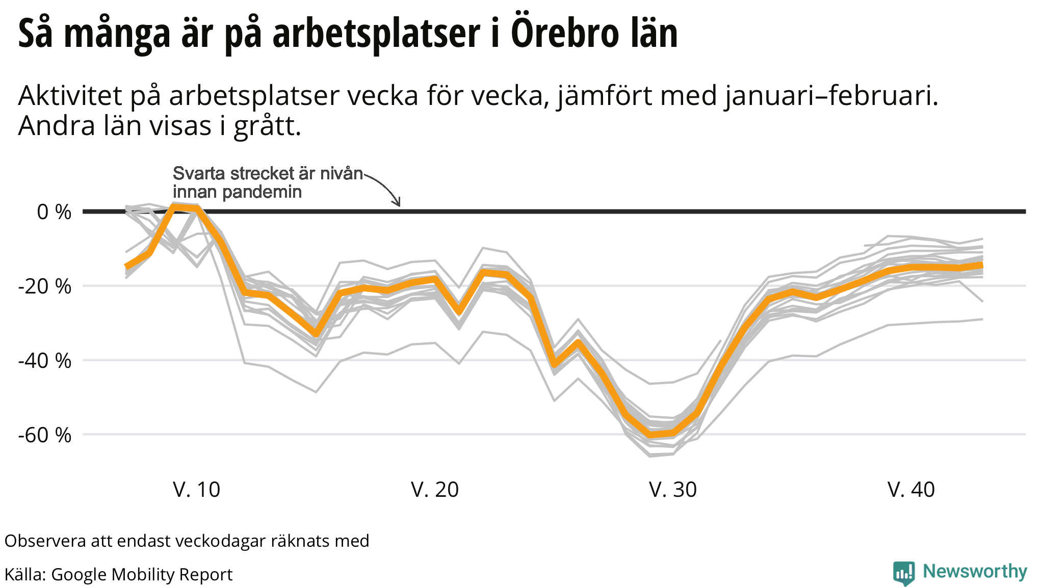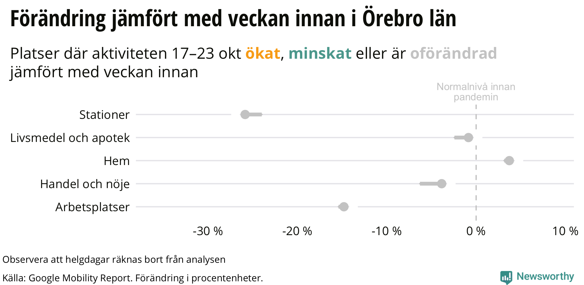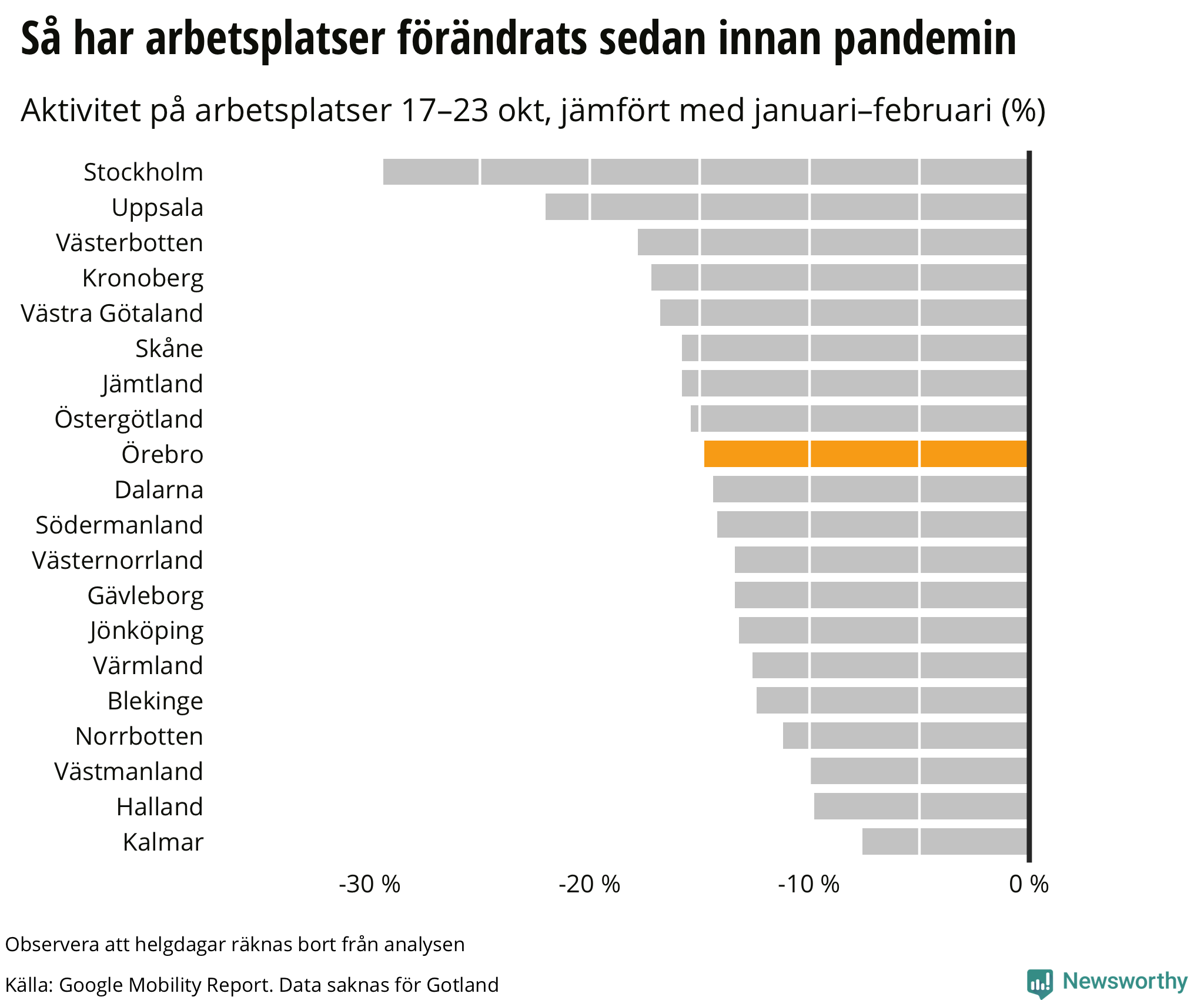 Google-rapporten använder en fem veckors-period i januari och februari som referens. Jämfört med den referensperioden var det mellan den 17 oktober och den 23 oktober 15 procent lägre aktivitet på arbetsplatser i Örebro.