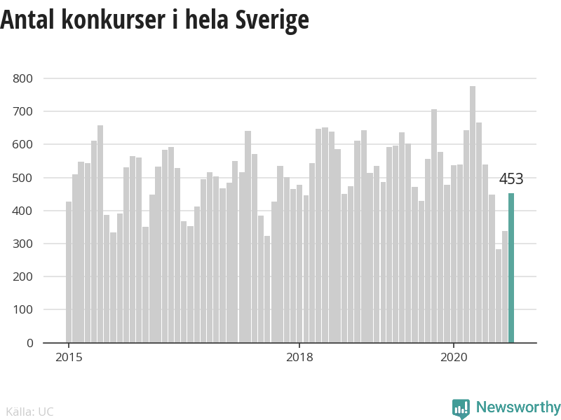I hela Sverige gick 453 företag i konkurs i oktober. Det är 253 färre än vid motsvarande tid i fjol (−36 procent). Jämför vi 2020 års samlade konkurser ser vi en nedgång med −2 procent.