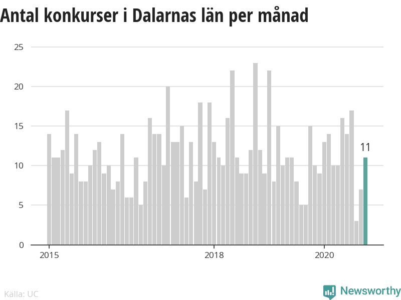 Under oktober månad gick elva bolag i konkurs i Dalarna. Det är en tämligen normal nivå för den här tiden på året. I fjol noterades 15 konkurser under oktober.
