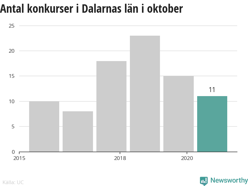 Följande graf visar antalet konkurser i Dalarna i enbart oktober under de senaste åren.