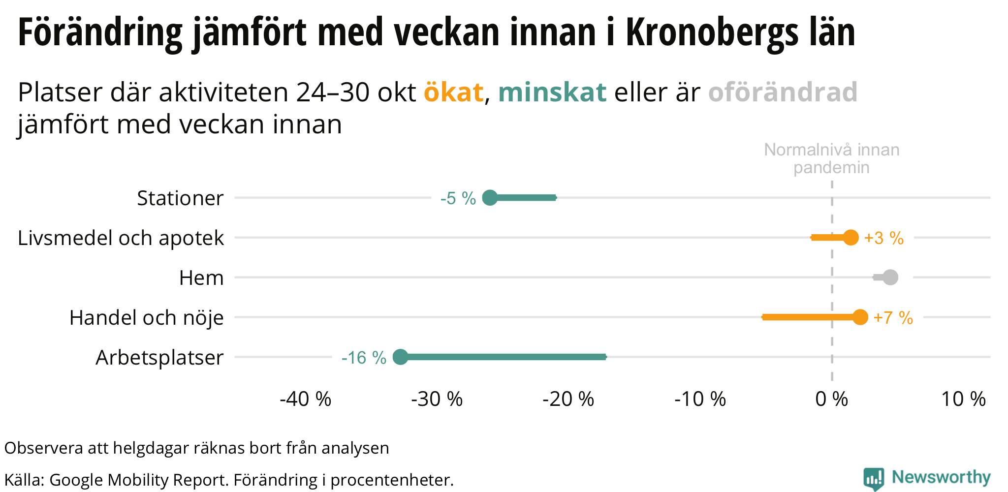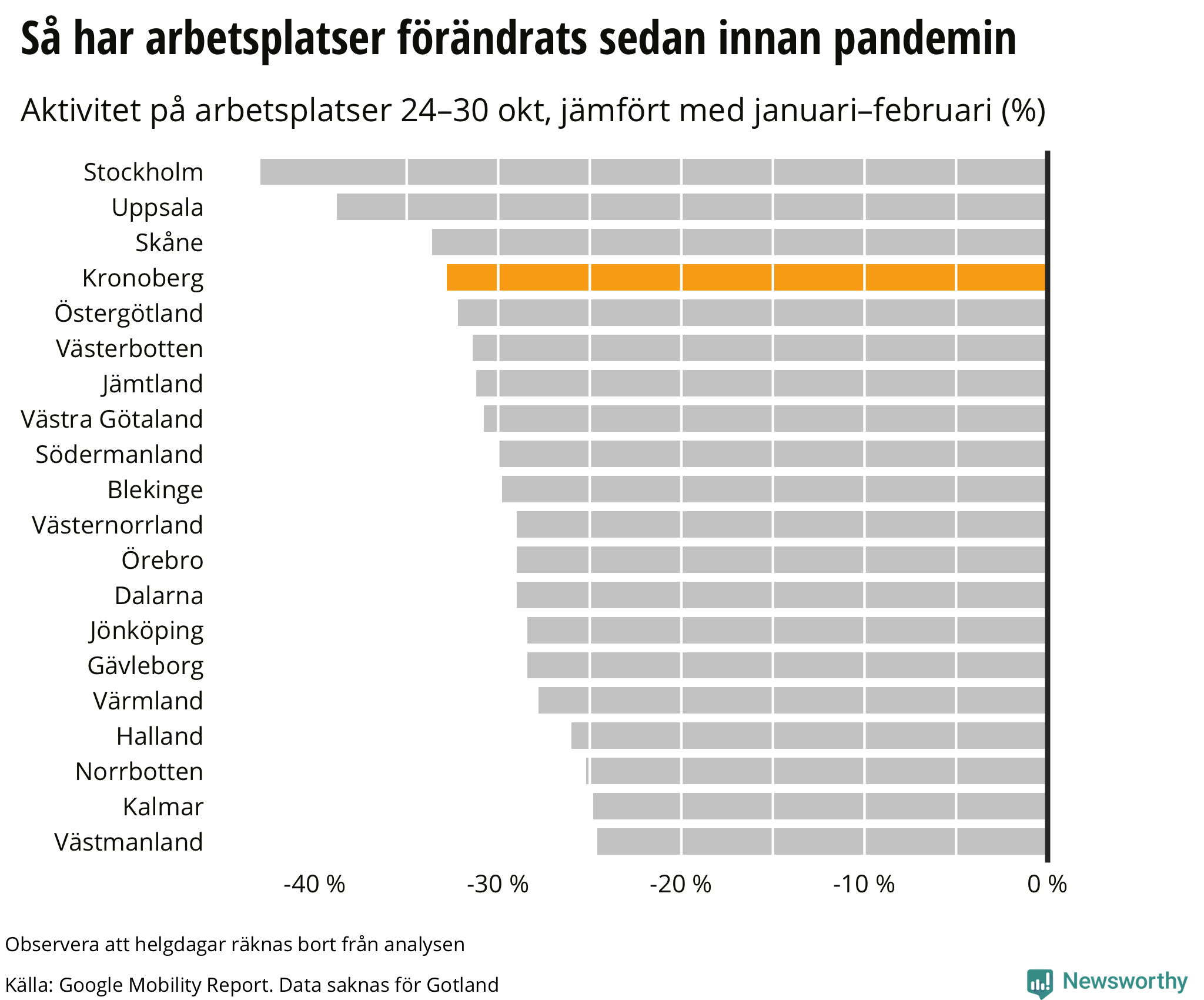 Googles senaste siffror, som publicerades nyligen, visar att invånarna i Kronoberg rörde sig mindre på arbetsplatser mellan den 24 oktober och den 30 oktober än veckan innan.