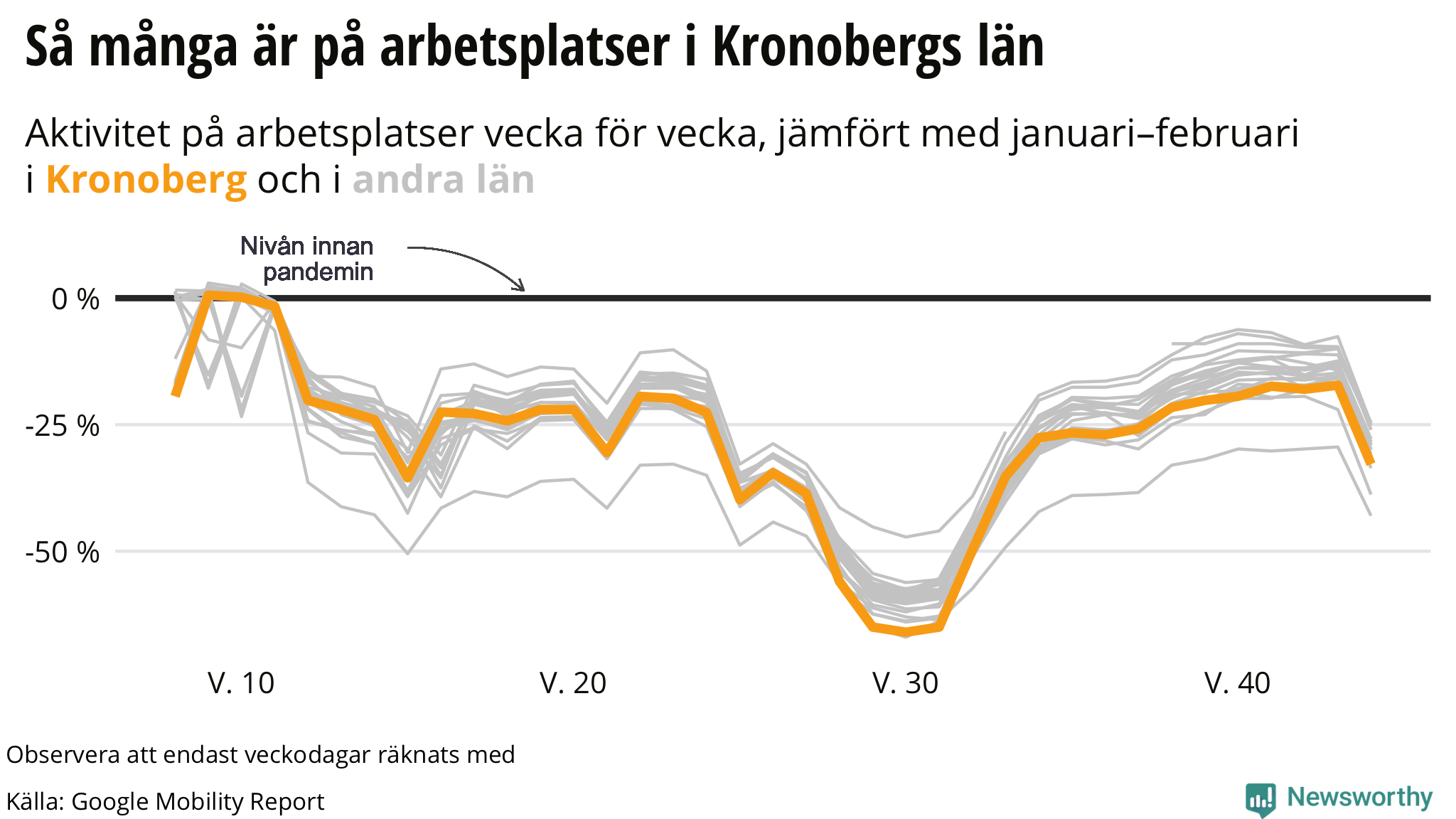Google-rapporten använder en fem veckors-period i januari och februari som referens. Jämfört med den referensperioden var det mellan den 24 oktober och den 30 oktober 33 procent lägre aktivitet på arbetsplatser i Kronoberg.