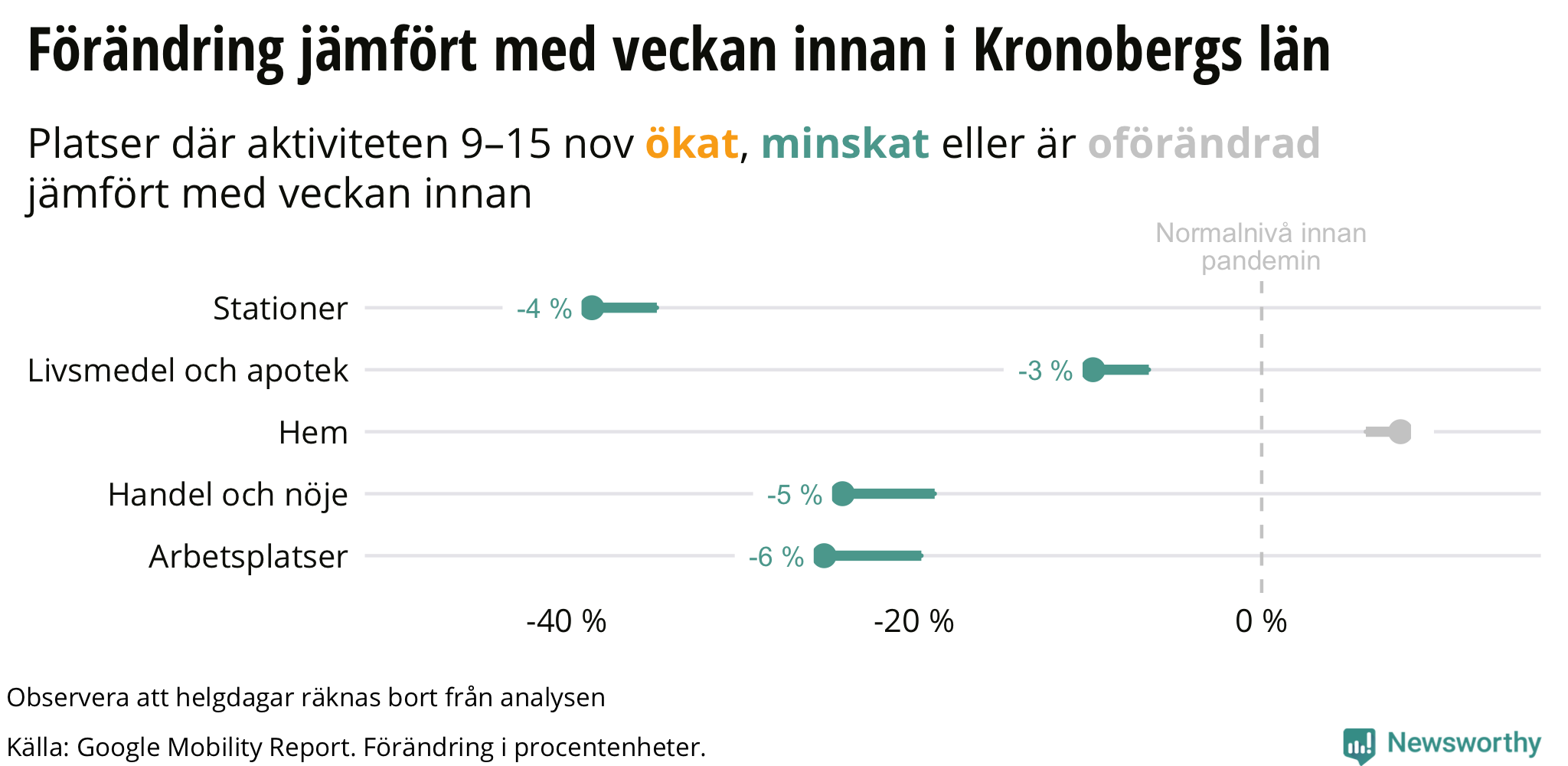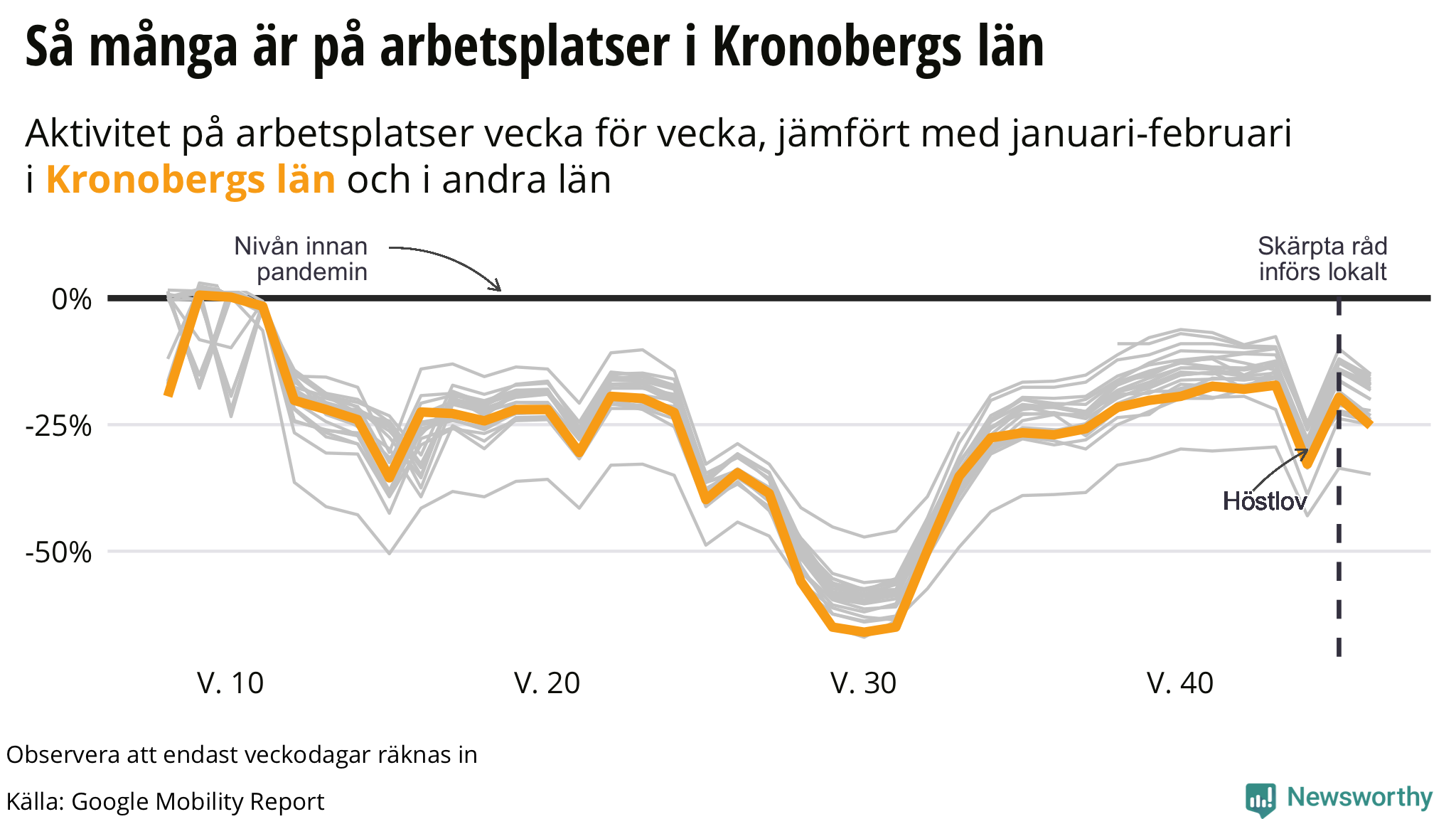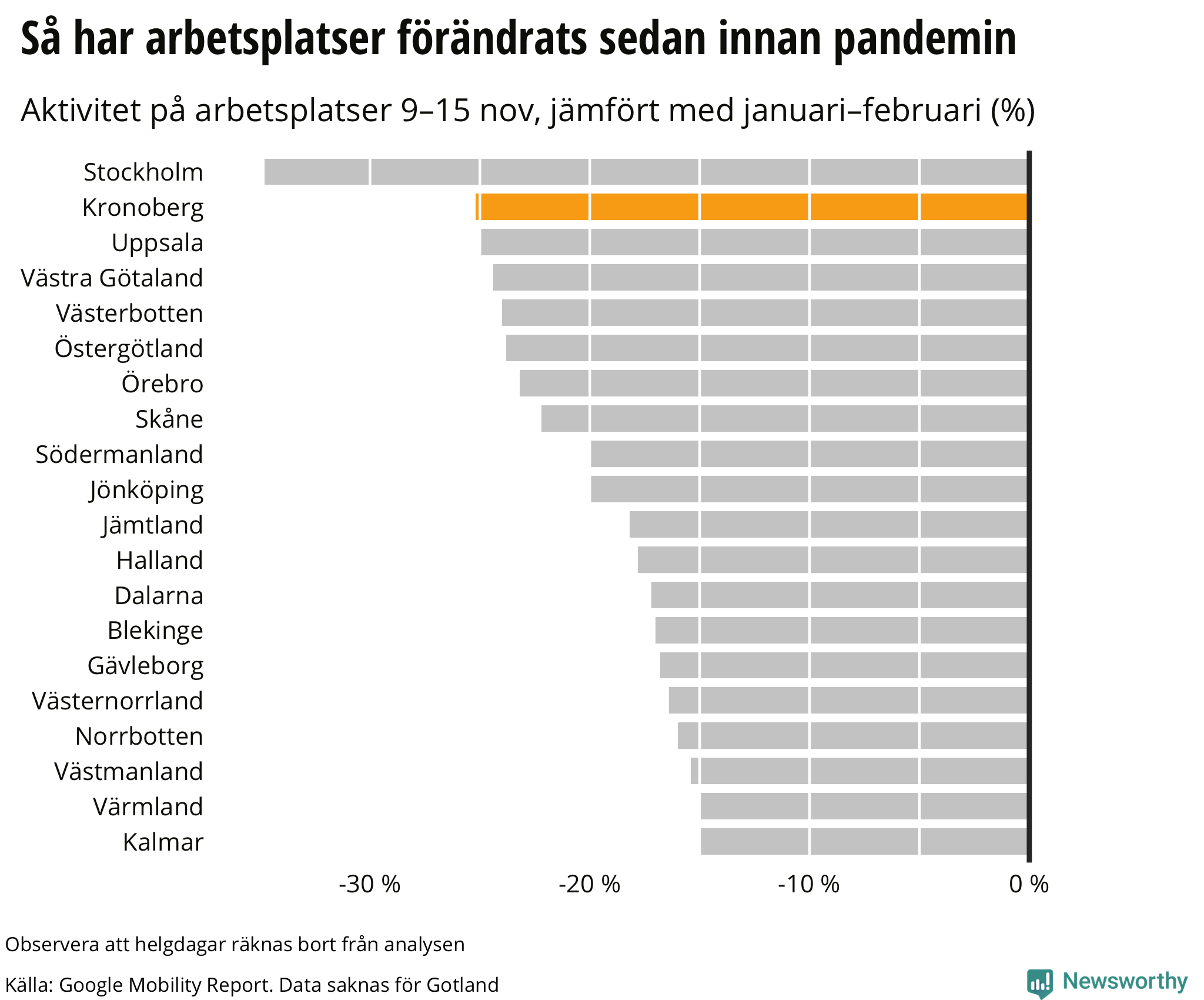 Googles senaste siffror, som publicerades nyligen, visar att invånarna i Kronoberg rörde sig mindre på arbetsplatser mellan den 9 november och den 15 november än veckan innan.