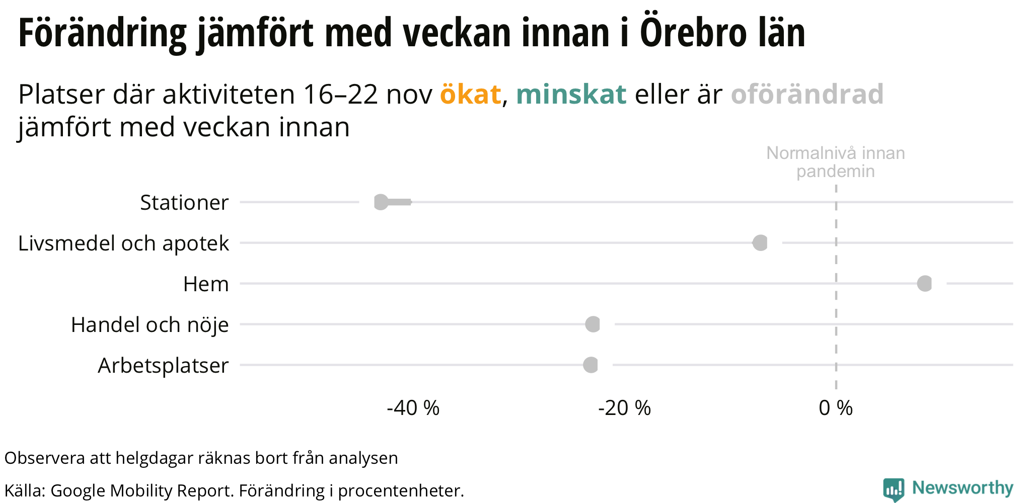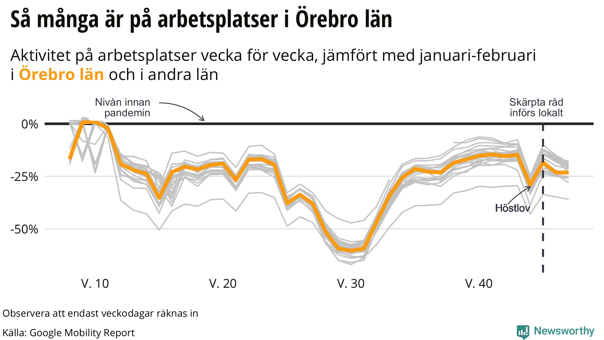 Googles senaste siffror, som publicerades nyligen, visar att invånarna i Örebro rörde sig ungefär lika mycket på arbetsplatser mellan den 16 november och den 22 november som veckan innan, men fortfarande betydligt mindre än innan pandemin.