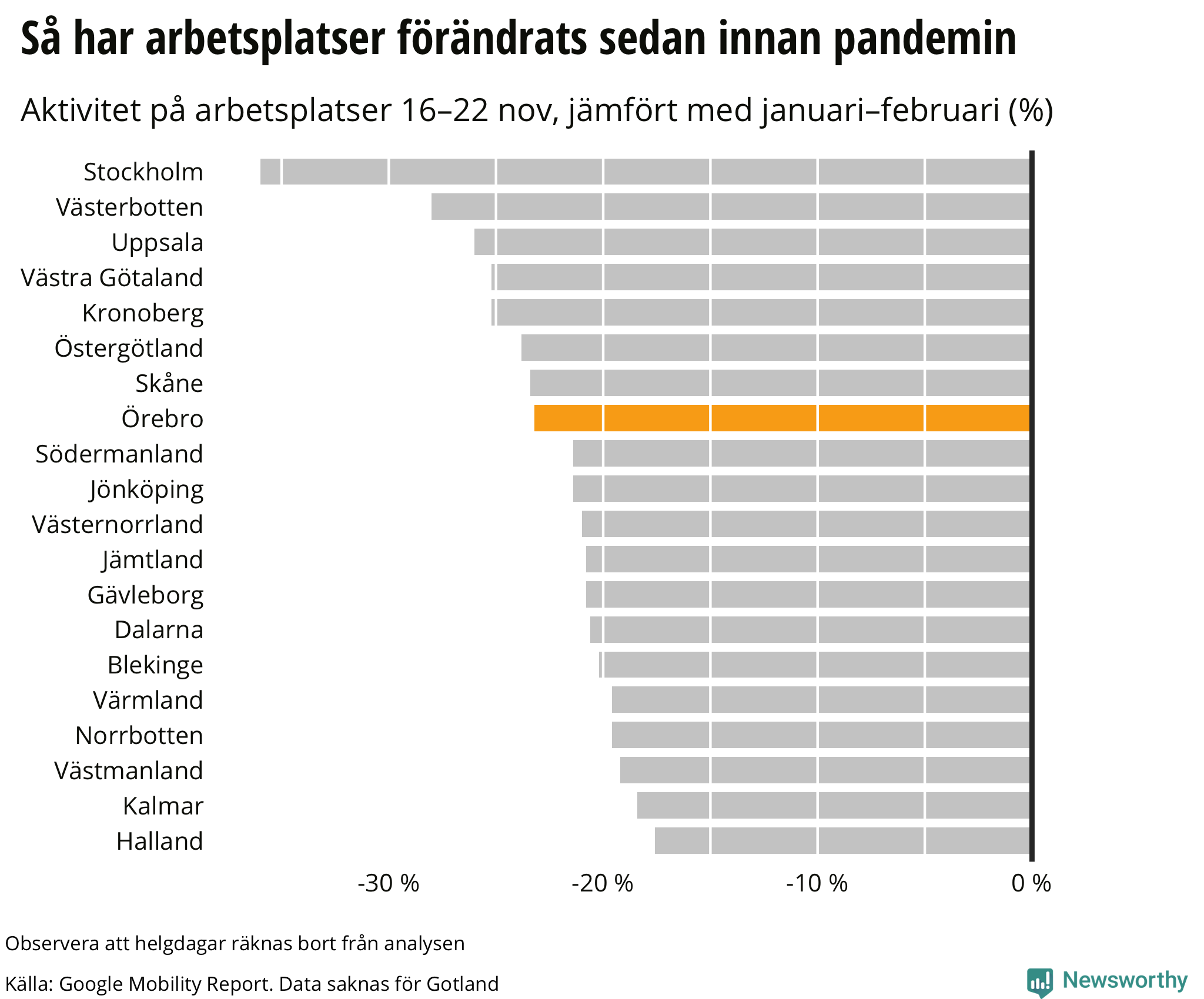 Google-rapporten använder en fem veckors-period i januari och februari som referens. Jämfört med den referensperioden var det mellan den 16 november och den 22 november 23 procent lägre aktivitet på arbetsplatser i Örebro.