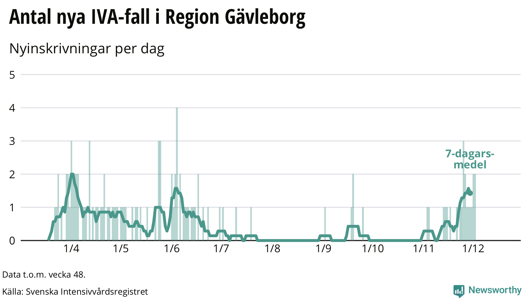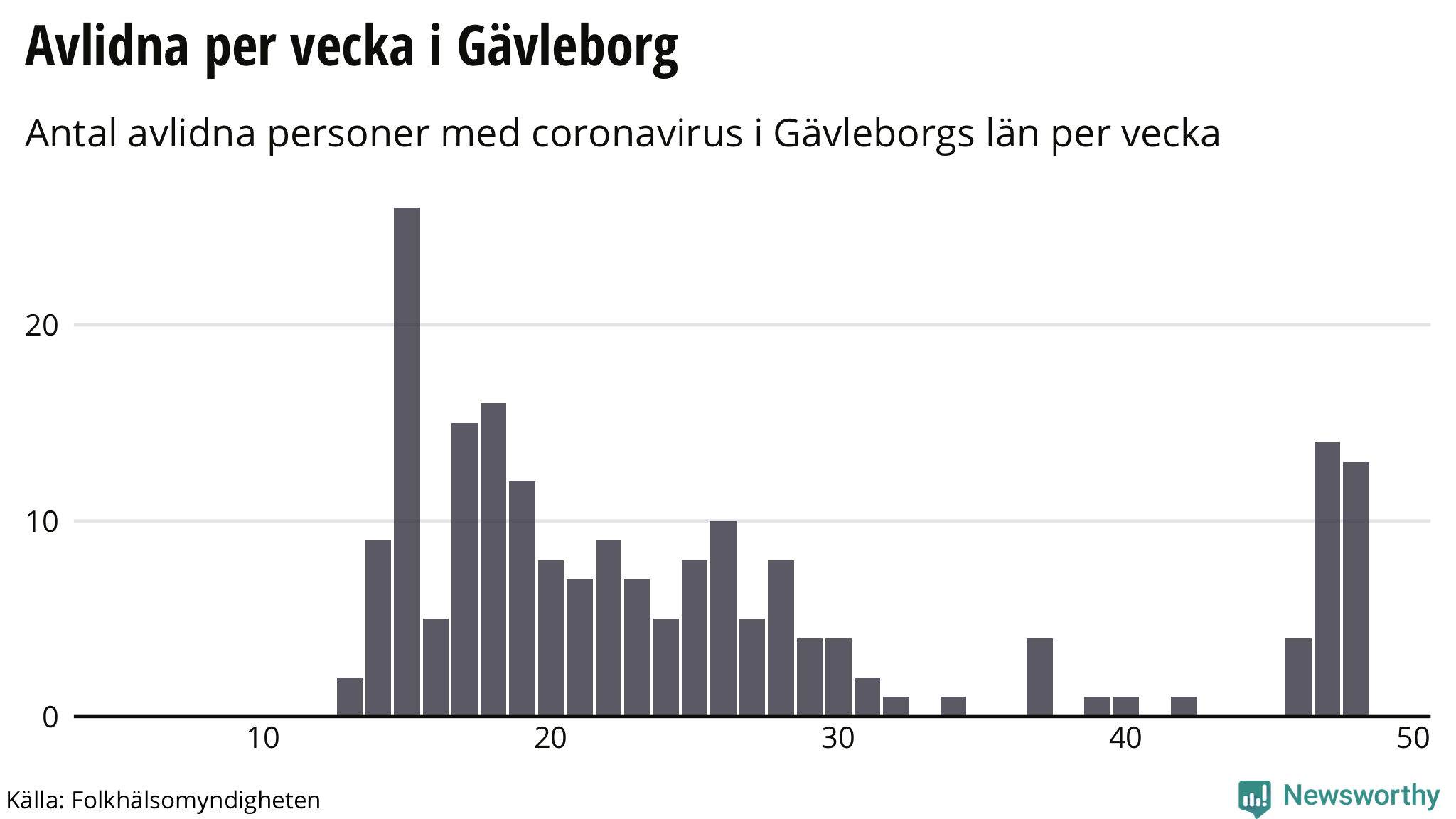 Under vecka 48 rapporterade Gävleborgs län att 13 personer avlidit med coronavirus (notera att statistiken över dödsfall är också på regionnivå).