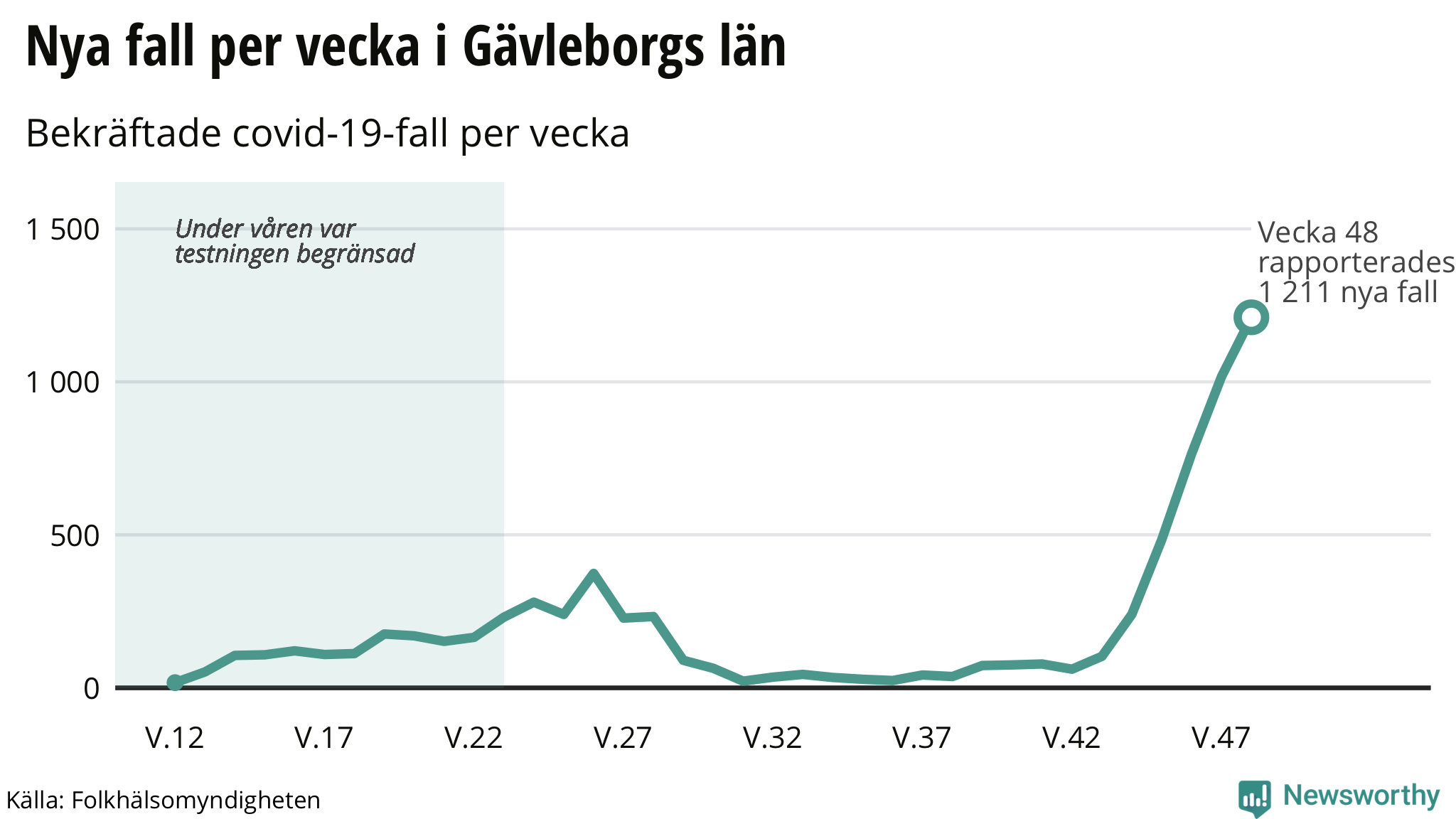 I hela Gävleborgs län rapporterades 1 211 nya fall den senaste veckan, vilket är betydligt fler än under den föregående veckan (+19 procent).