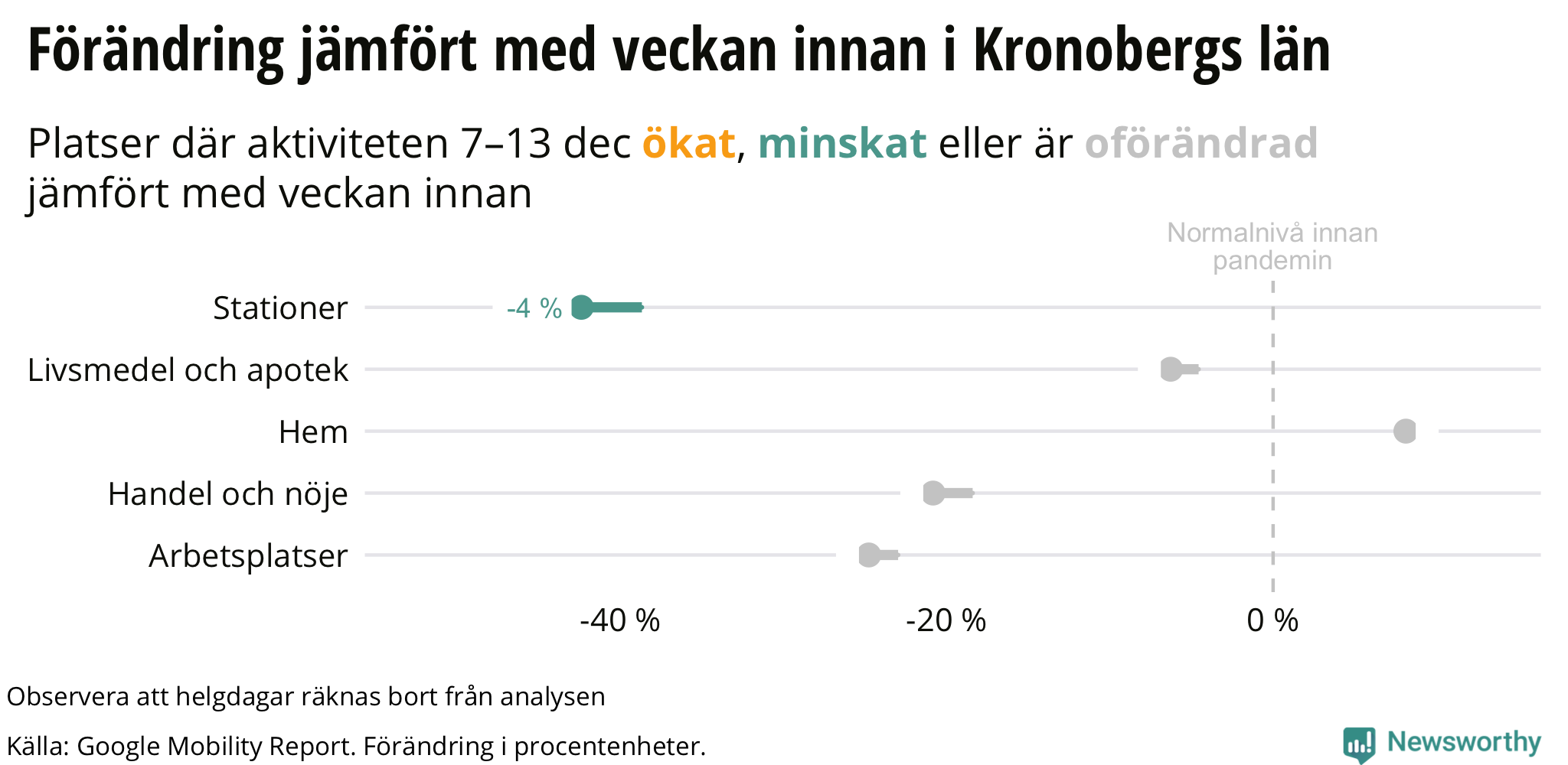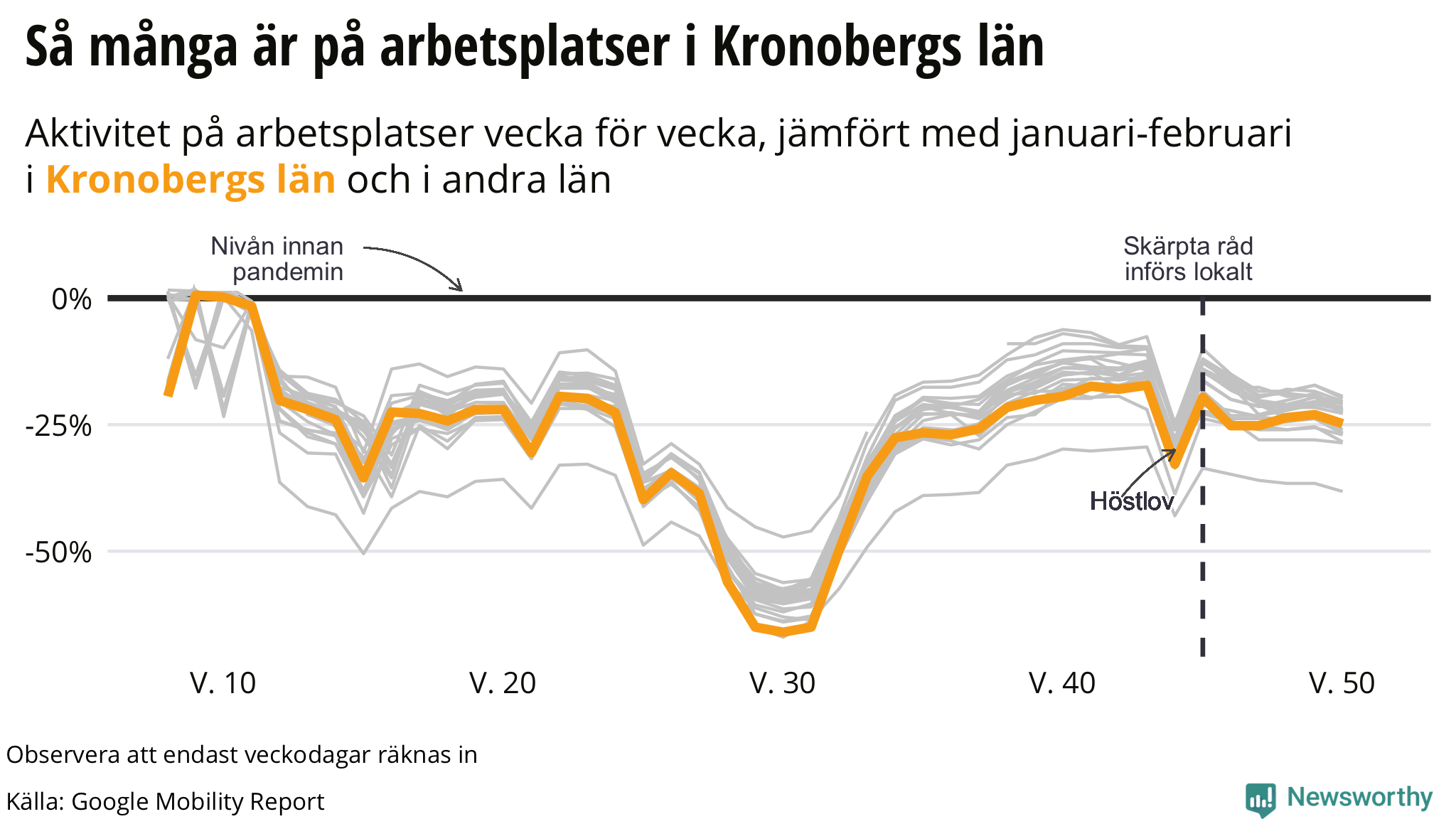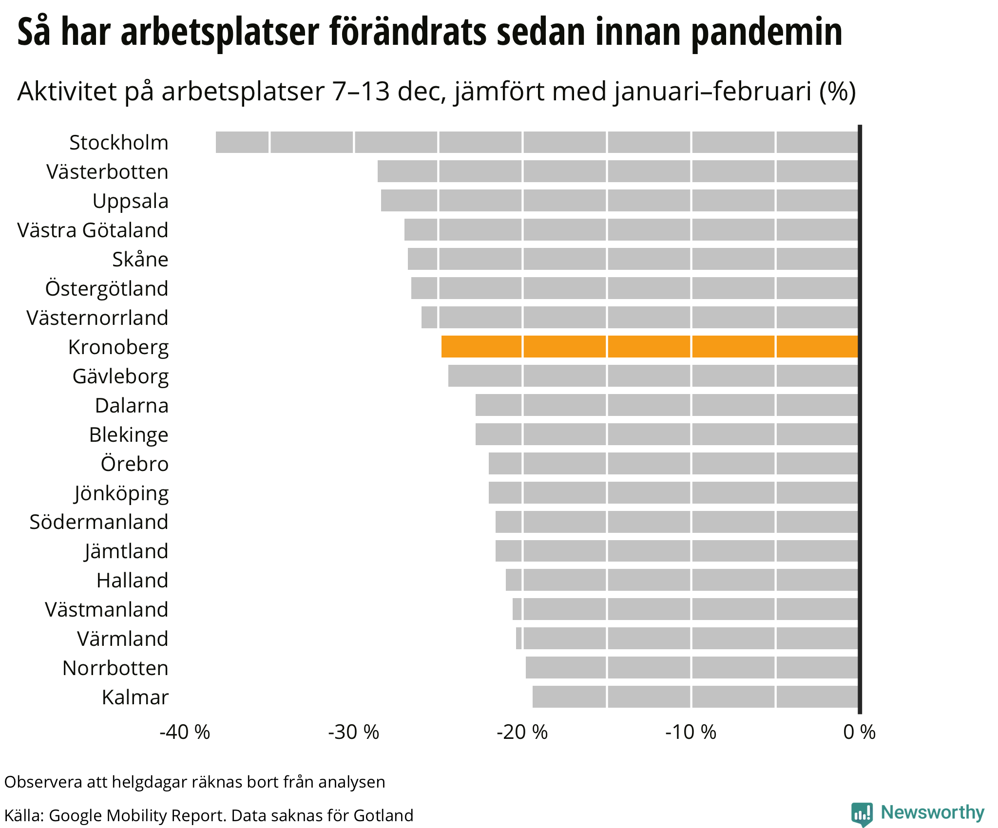 Googles senaste siffror, som publicerades nyligen, visar att invånarna i Kronoberg rörde sig ungefär lika mycket på arbetsplatser mellan den 7 december och den 13 december som veckan innan, men fortfarande betydligt mindre än innan pandemin.