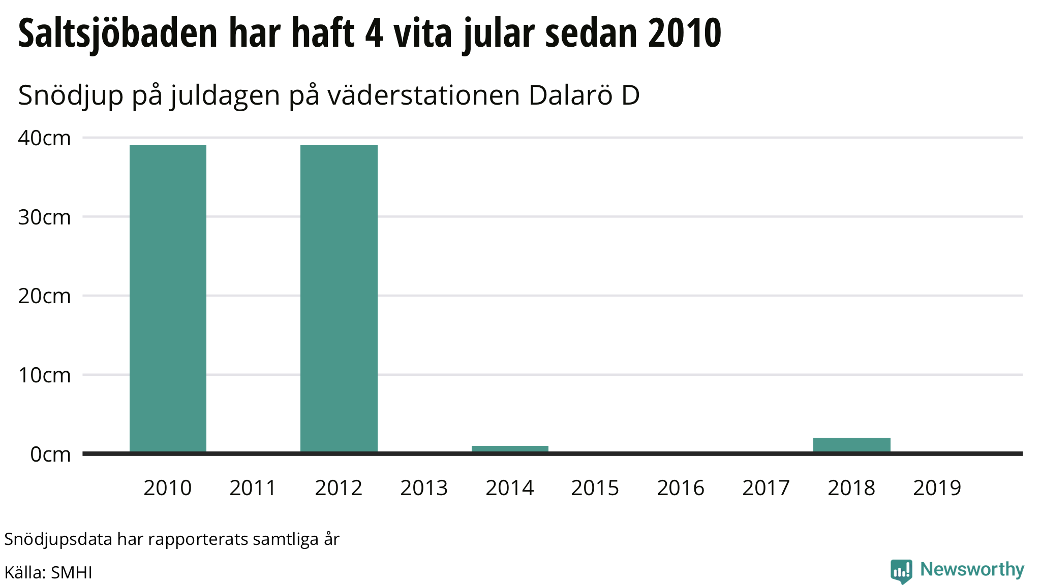 Hur ser det ut i Saltsjöbaden? Vid mätstationen Dalarö D, den närmaste mätstationen som har data för snödjup, har det varit minst en centimeter snö på juldagens morgon under fyra av nio år på 2010-talet. Allra mest snö kom det år 2010 då det fanns 39 centimeter snö på marken, medan åren c(2011, 2013, 2015, 2016, 2017 och 2019) var helt snöfria.