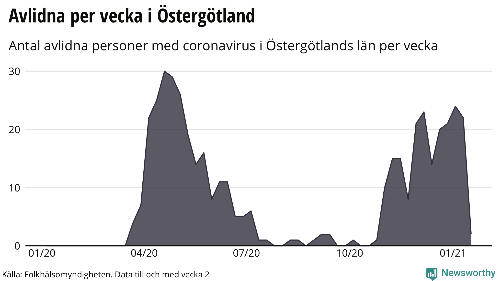 Under vecka 2 rapporterade Östergötlands län att 2 personer avlidit med coronavirus (notera att statistiken över dödsfall är också på regionnivå).