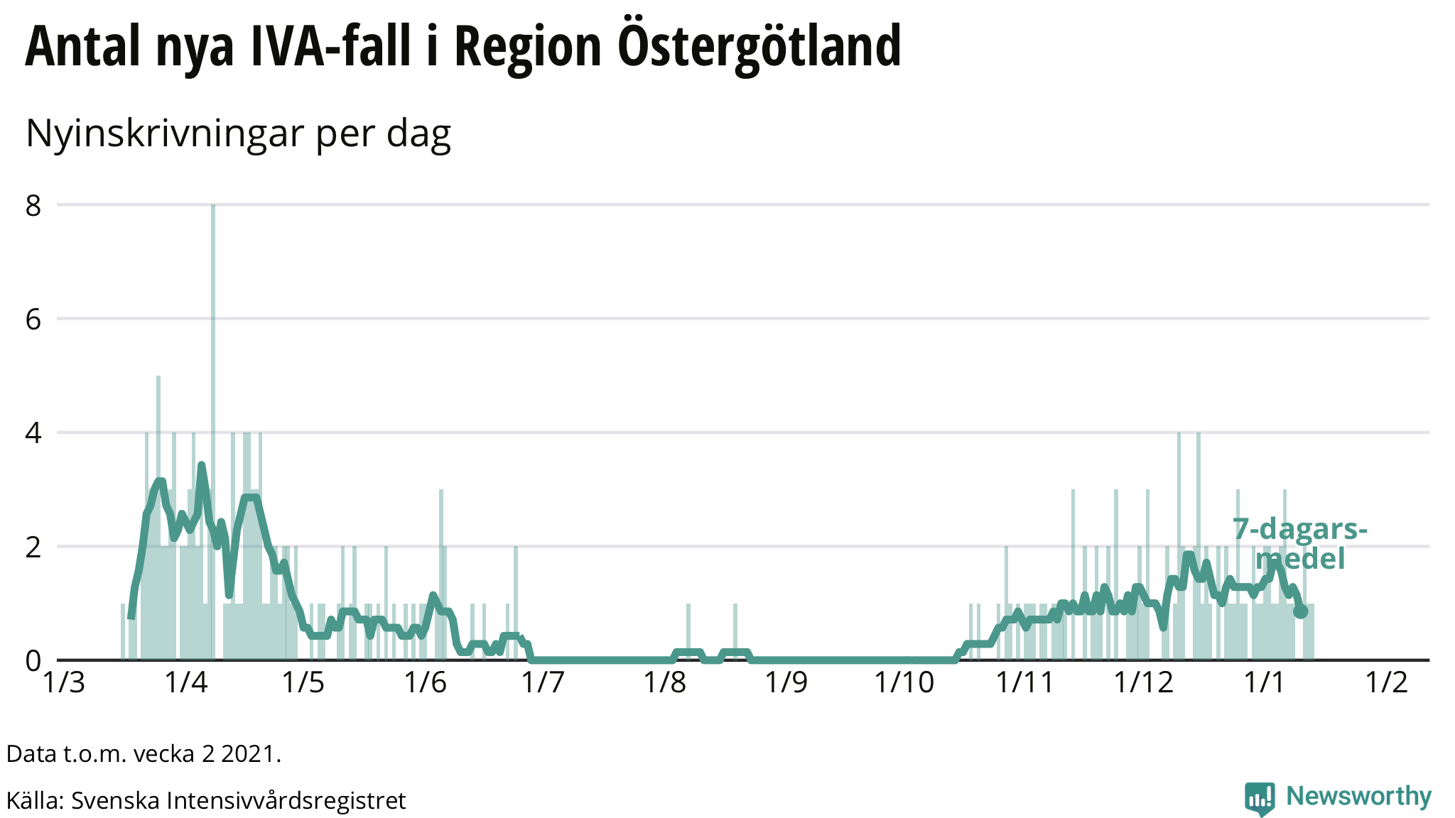 Bekräftade fall beror mycket på antalet tester som görs, något som varierat stort under året. Antalet nya patienter som skrivs in på intensivvårdsavdelningar ger en klarare bild av hur pressad sjukvården är i Östergötlands län och i andra delar av landet. Svenska Intensivvårdsregistret presenterar dessa siffror.