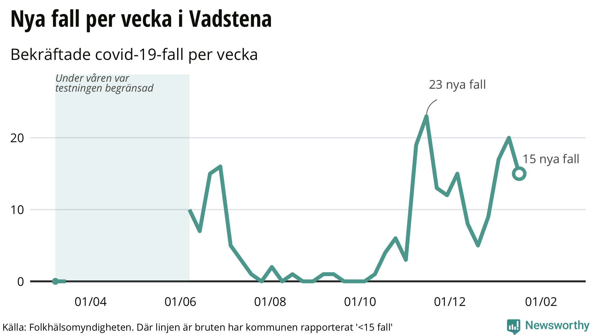 Den senaste veckan har 15 nya bekräftade fall av covid-19 rapporterats i Vadstena kommun. Det är en nedgång jämfört med den föregående veckan (−5 fall).