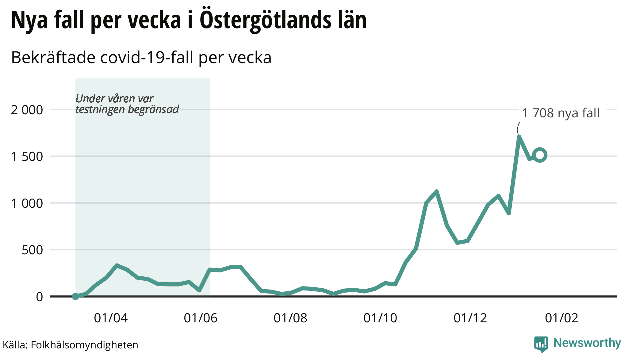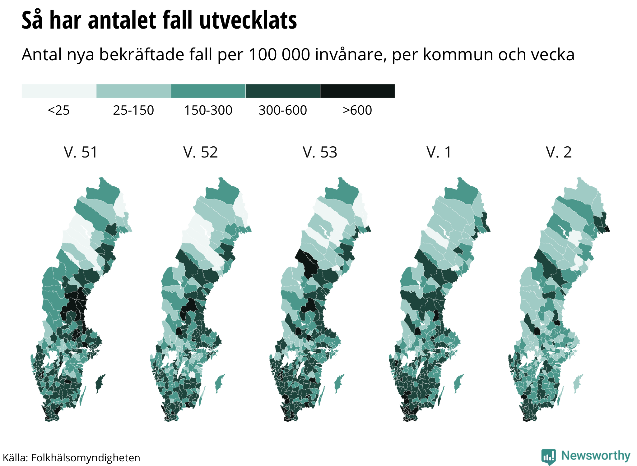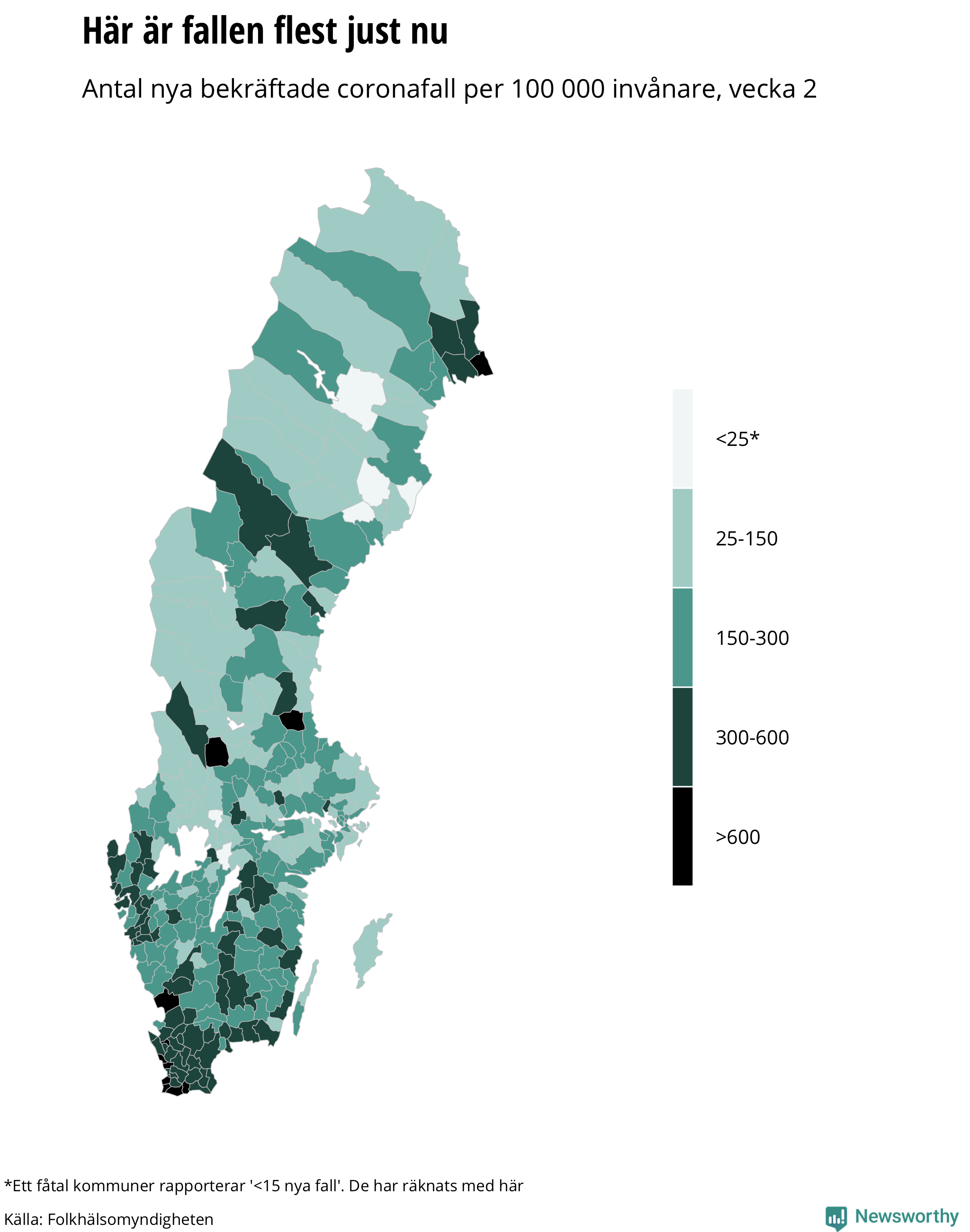 Newsworthy sammanställer varje vecka en rapport om coronaviruset och vaccinering i Sverige, kommun för kommun och län för län, baserat på statistik från Folkhälsomyndigheten.
