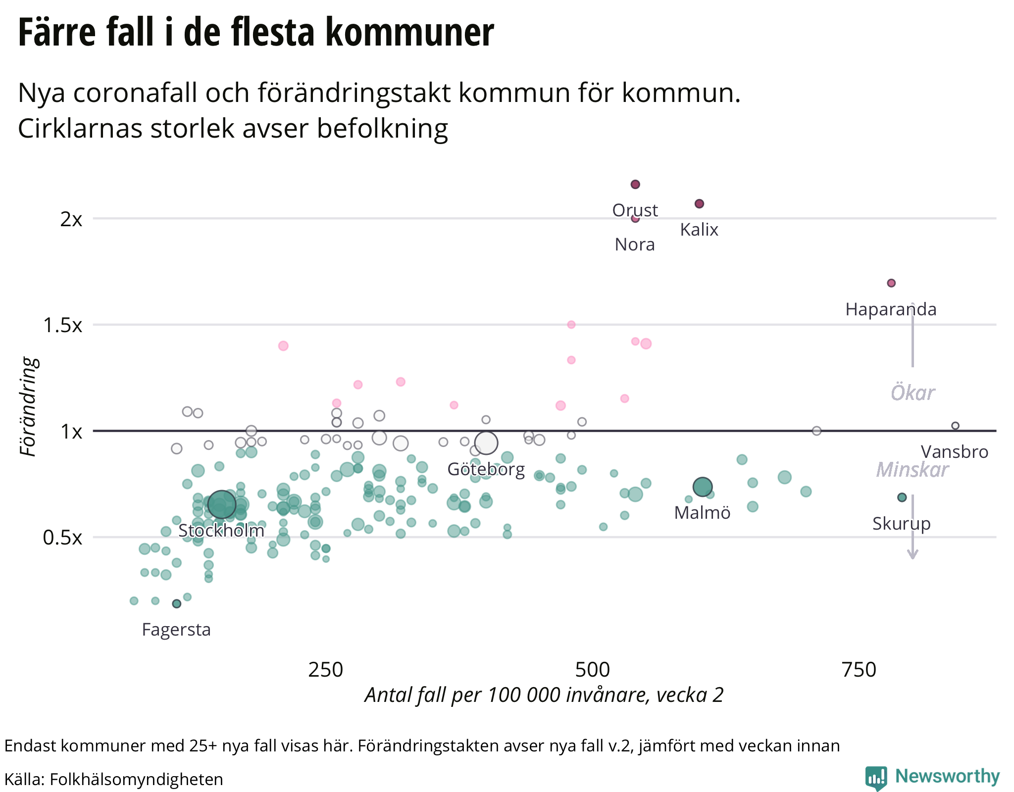 Grafen nedan visar utvecklingen jämfört med veckan innan kommun för kommun, för alla kommuner som rapporterat minst 25 fall.
