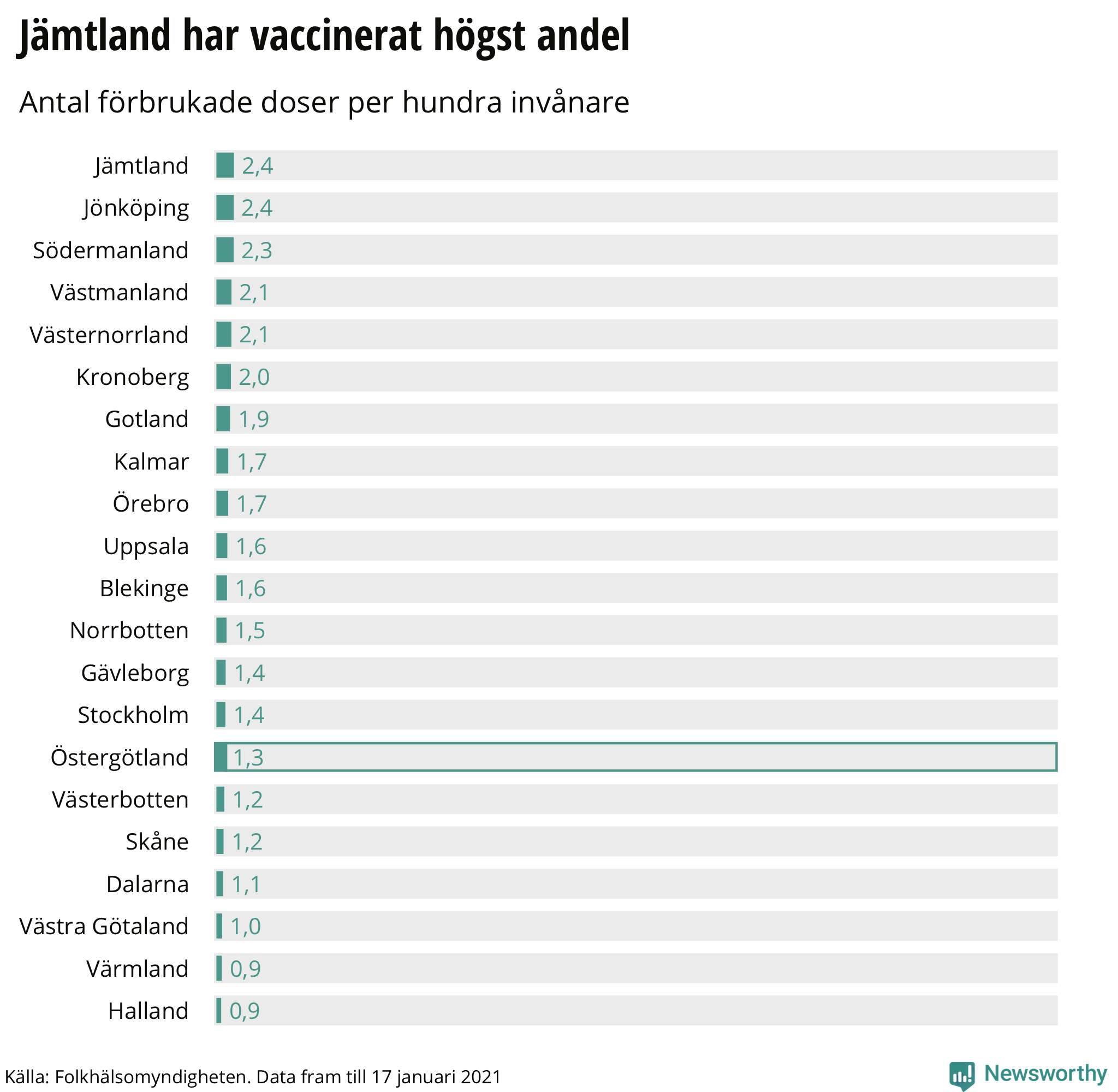 Det motsvarar drygt 1,3 doser per hundra invånare.