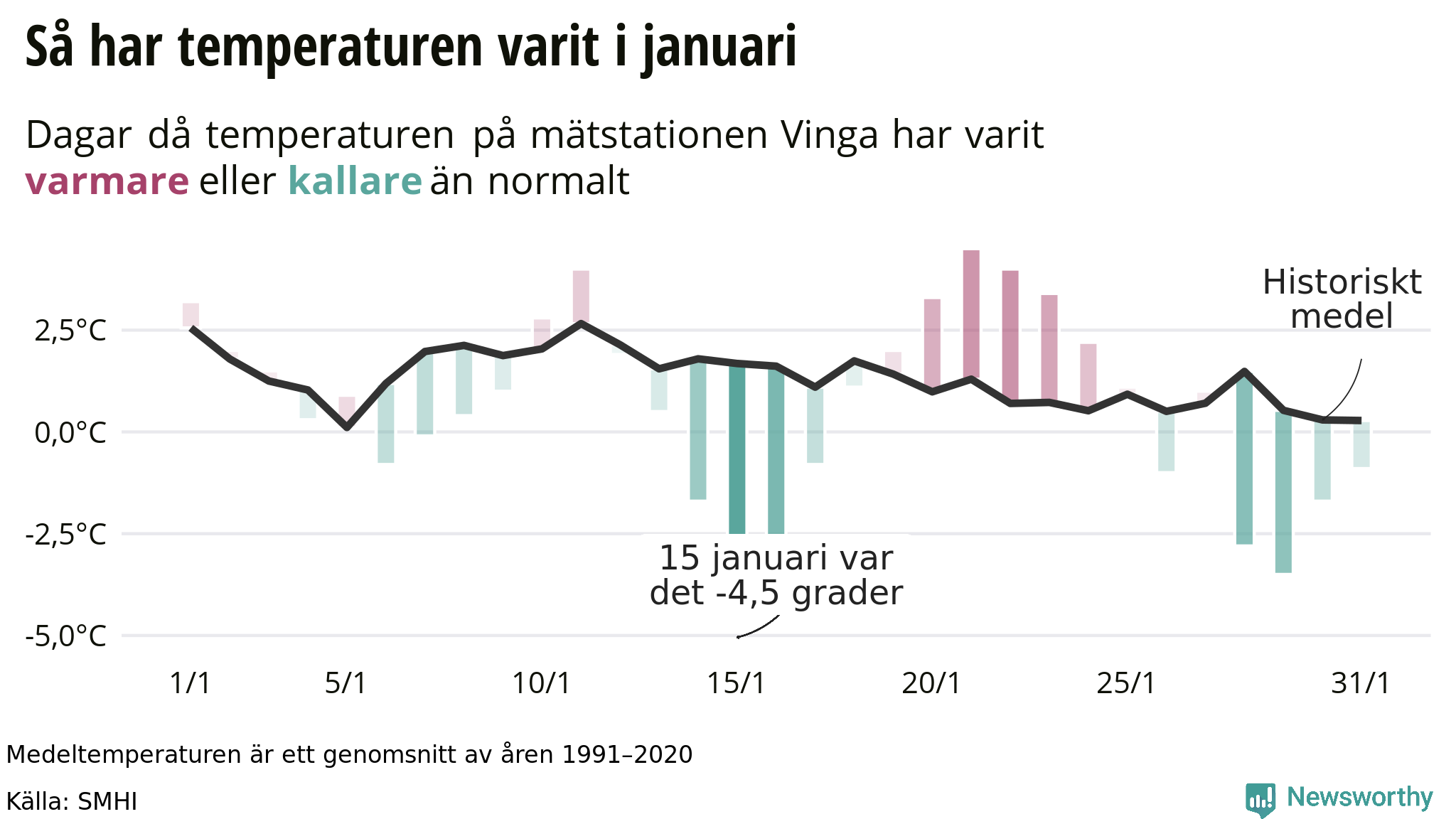 - Den historiska medeltemperaturen, som vi beskriver som "normalnivå", är baserad på ett rakt medel av åren 1991–2020. Det är samma tidsspann som SMHI sedan år 2021 använder som referensperiod.