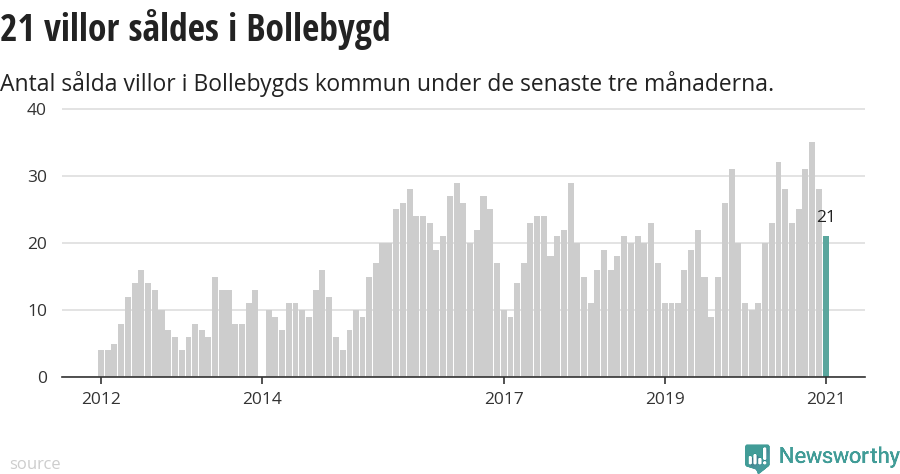 Mellan november och januari gjordes sammanlagt 21 affärer med villor i Bollebygds kommun. Det kan jämföras med elva vid motsvarande tid i fjol.