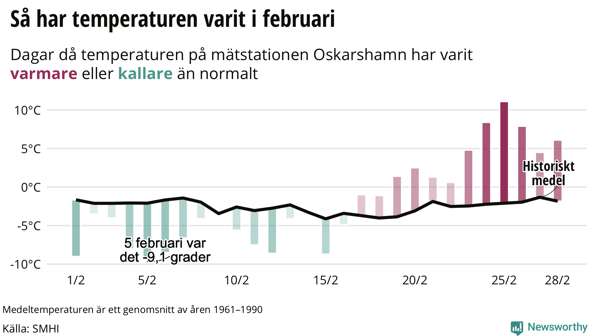 Februari var mildare än normalt i Oskarshamns kommun. Under 13 av 28 dagar låg dygnsmedeltemperaturen över det historiska snittet. Den 25 februari stack ut som den 3:e varmaste dagen för månaden på 103 år.