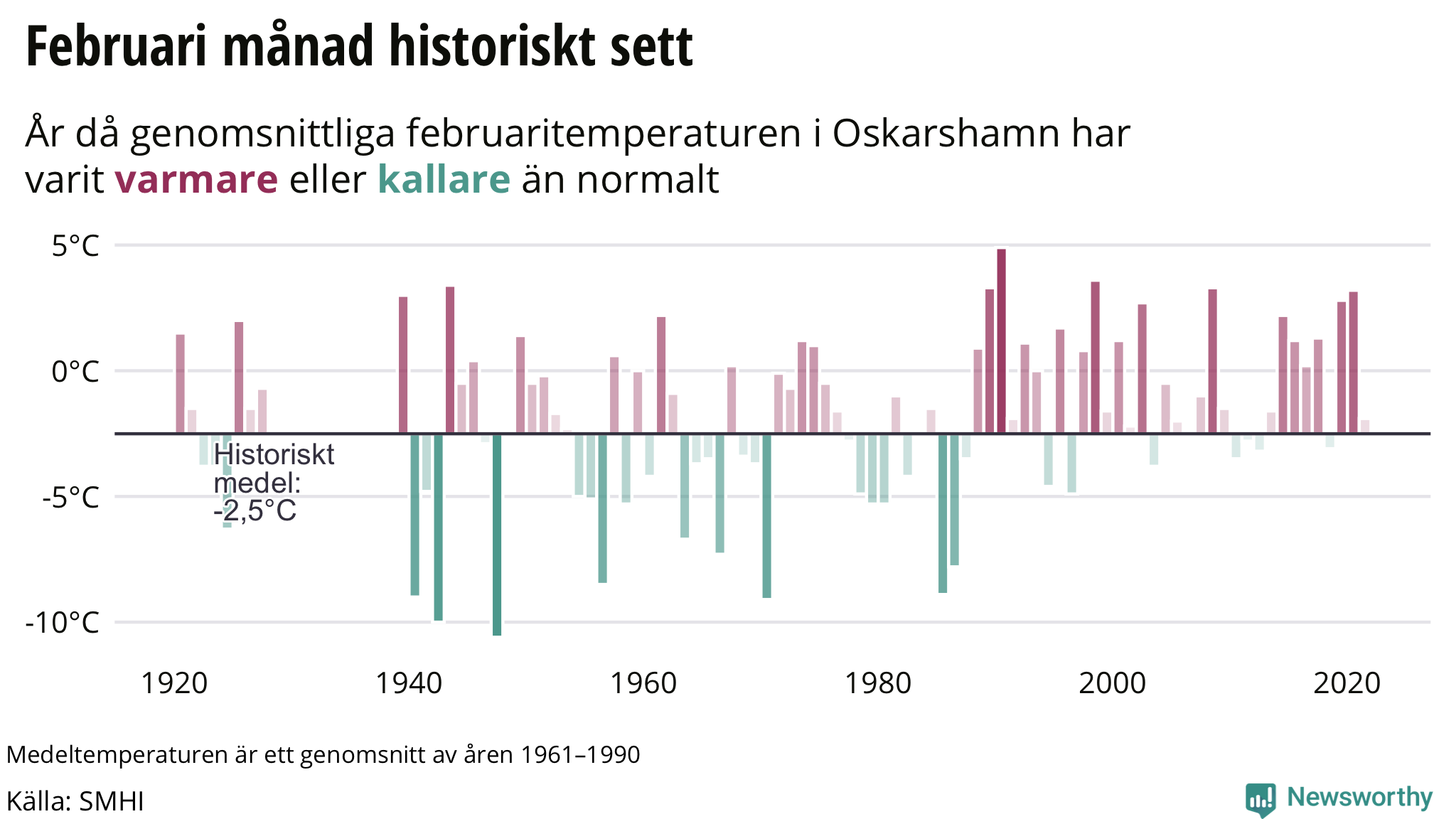 Med klimatförändringen kan vi förvänta oss gradvis varmare temperaturer. Under det senaste decenniet har februari varit varmare än snittet åtta av tio år i Oskarshamn.