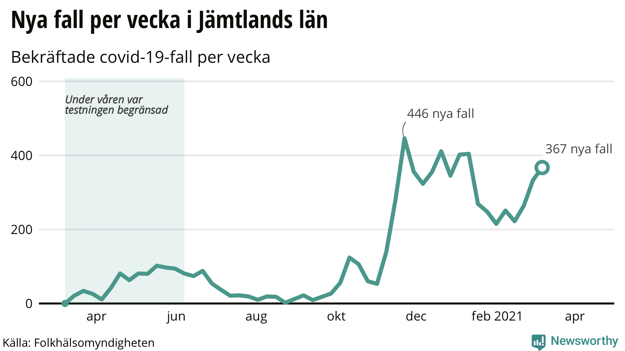 I hela Jämtlands län rapporterades 367 nya fall den senaste veckan, vilket är något fler än under den föregående veckan (+10 procent).