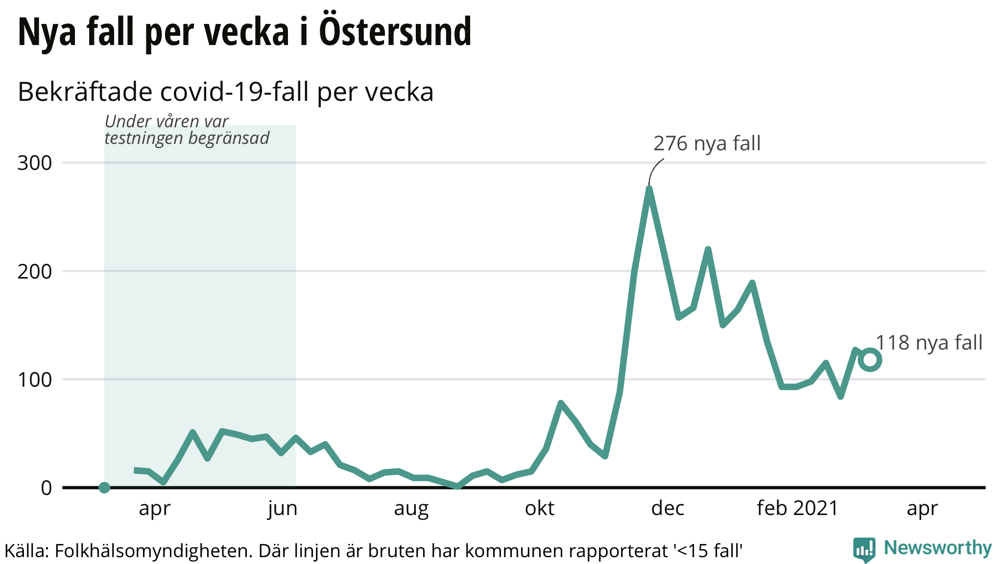 Den senaste veckan har 118 nya bekräftade fall av covid-19 rapporterats i Östersunds kommun. Det är ungefär samma nivå som under den föregående veckan.